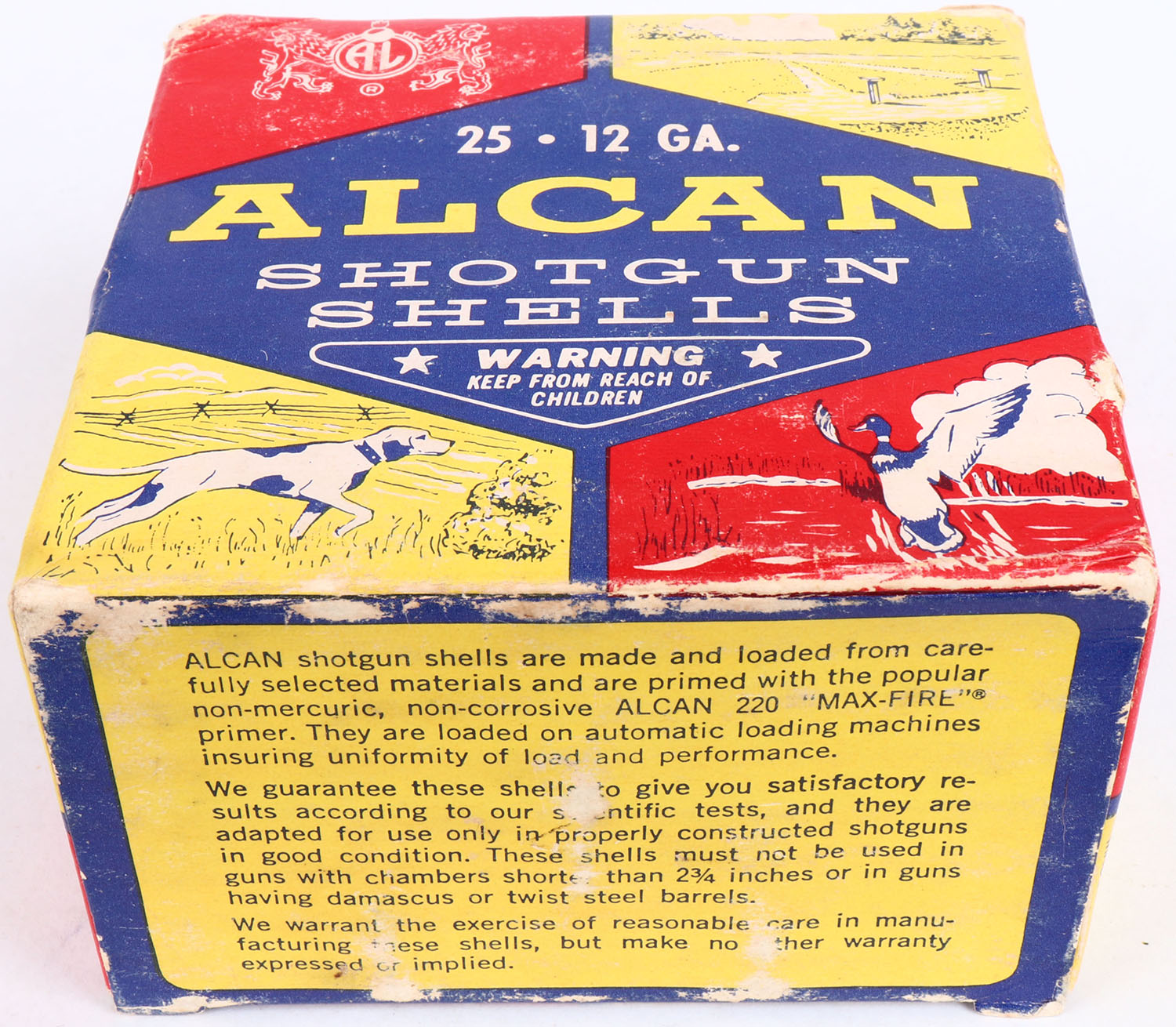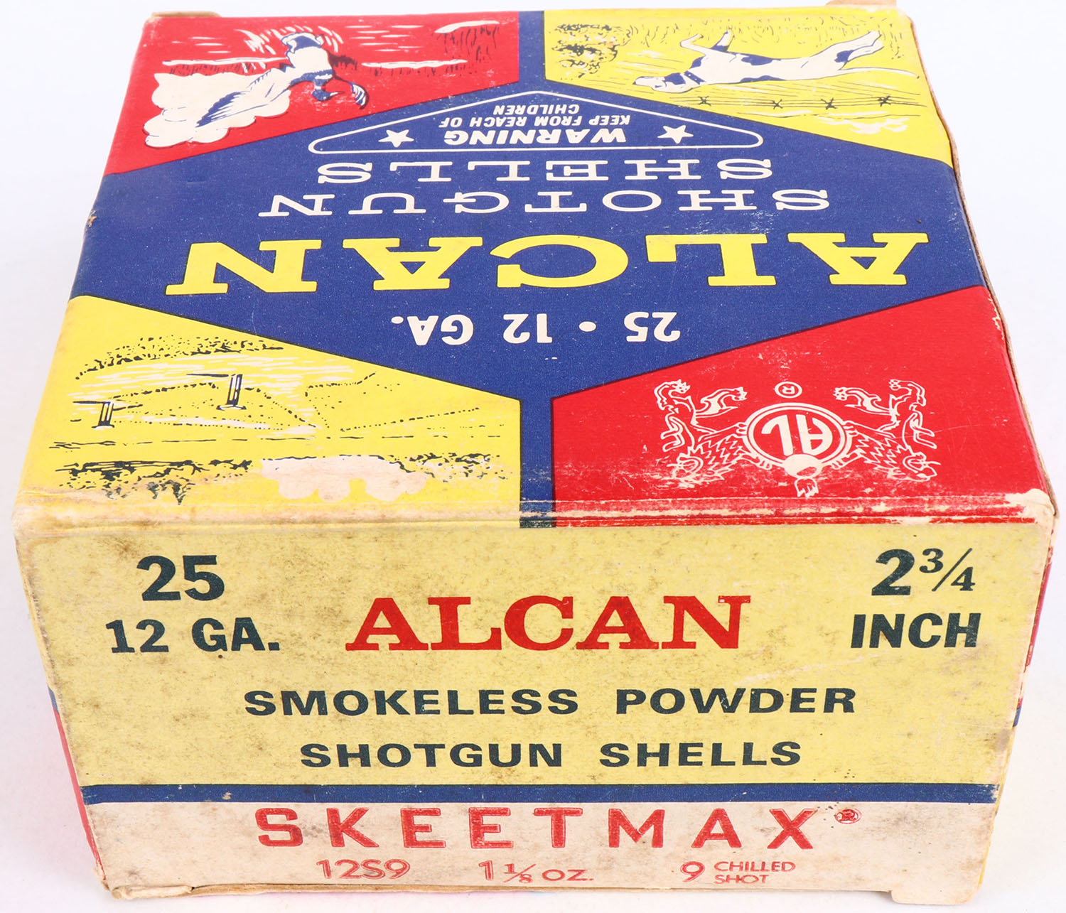 Alcan, 12ga., 1pc., Full, shot size 9 Chilled, multi-colored box, box is very solid, shells are very good. Grade: Excellent - Value: 10 to 20
