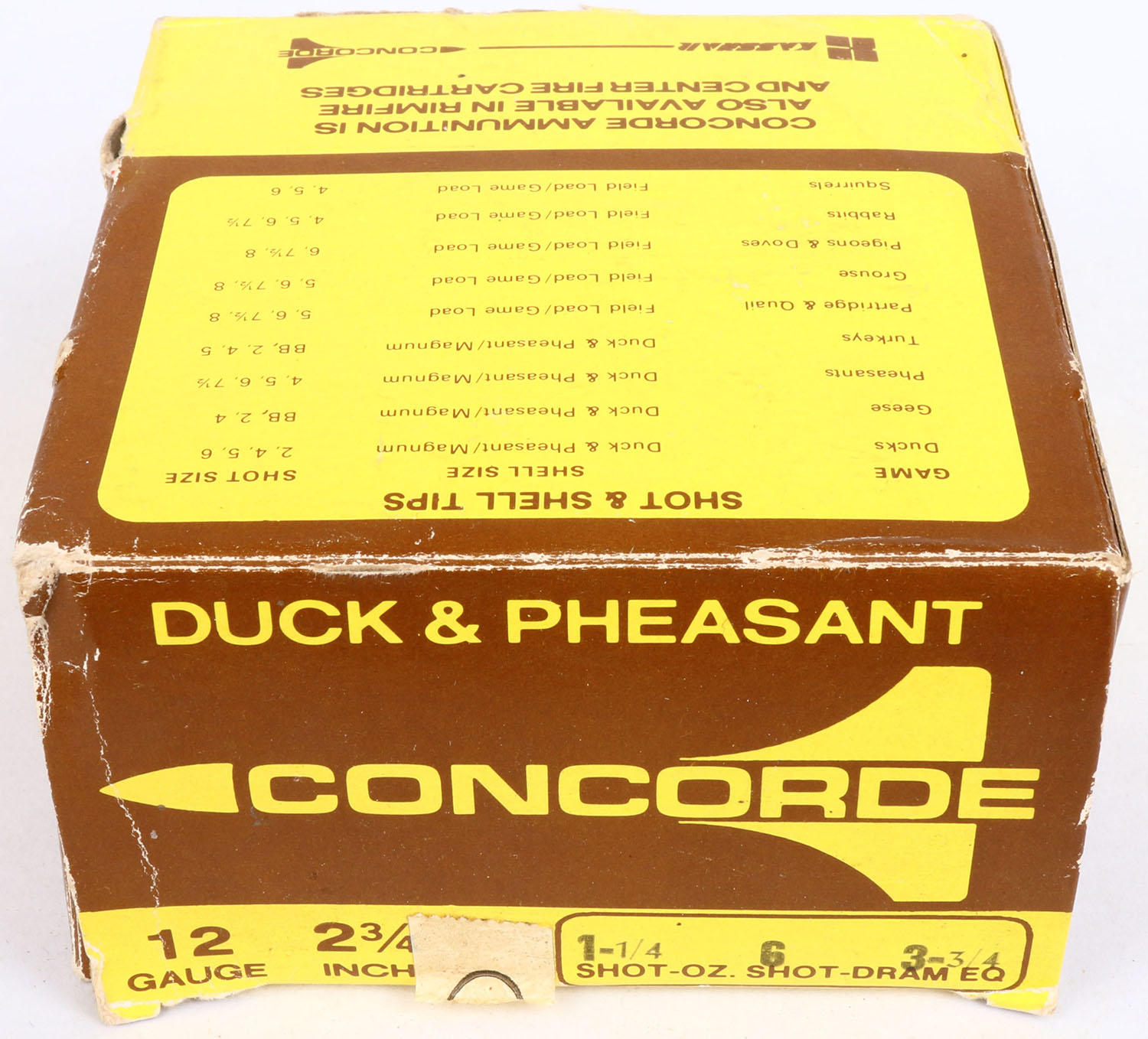 Concorde Duck & Pheasant, 12ga., 1pc., Partial 24rds, shot size 6, multi-colored box, box is solid, shells are excellent. Grade: Excellent - Value: 10 to 20