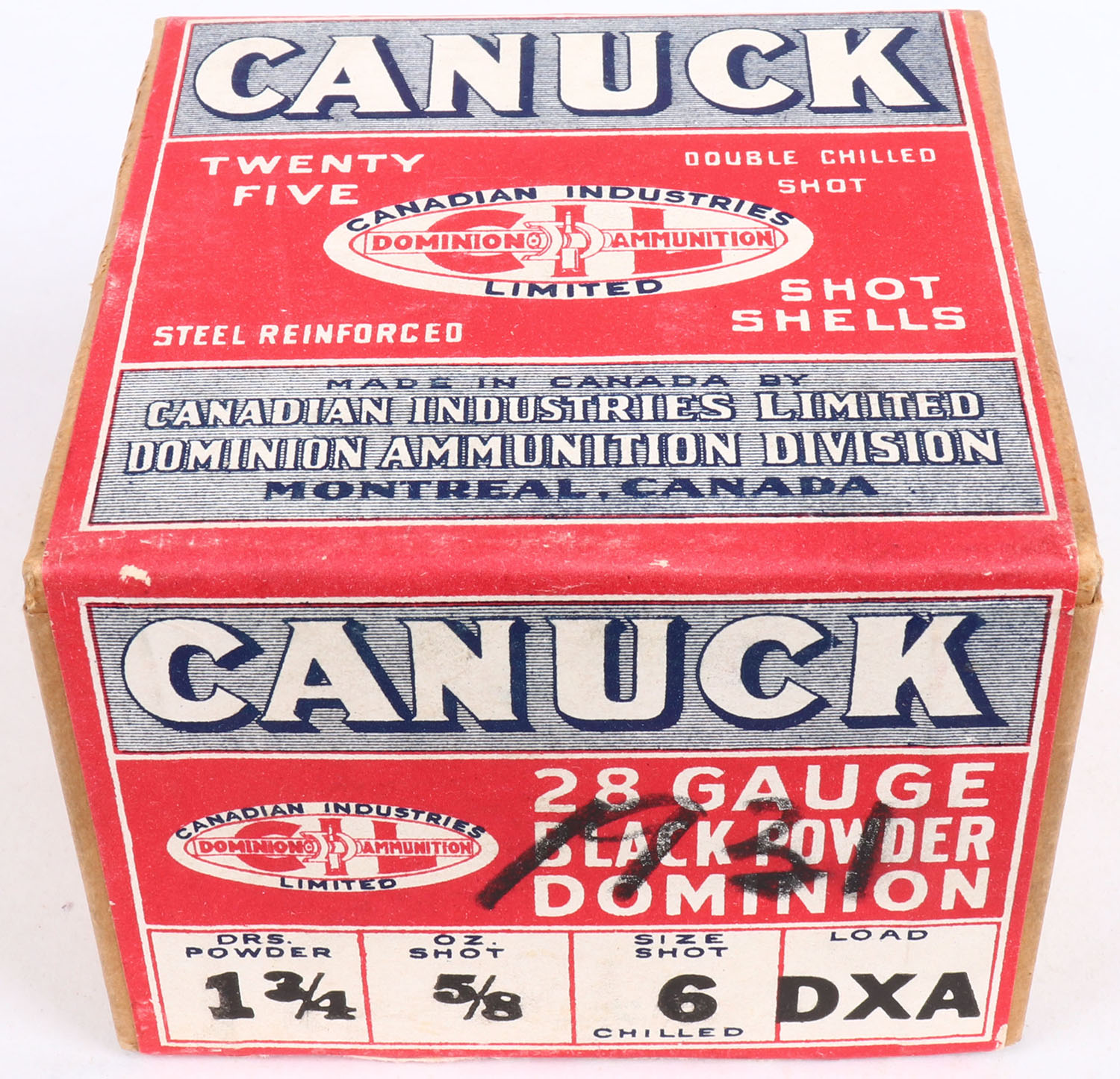 Canuck, 2pc., 28ga., FULL & SEALED, shot size 6 Double Chilled, box is very solid with great colors. Grade: Excellent ++ - Value: 20 to 200