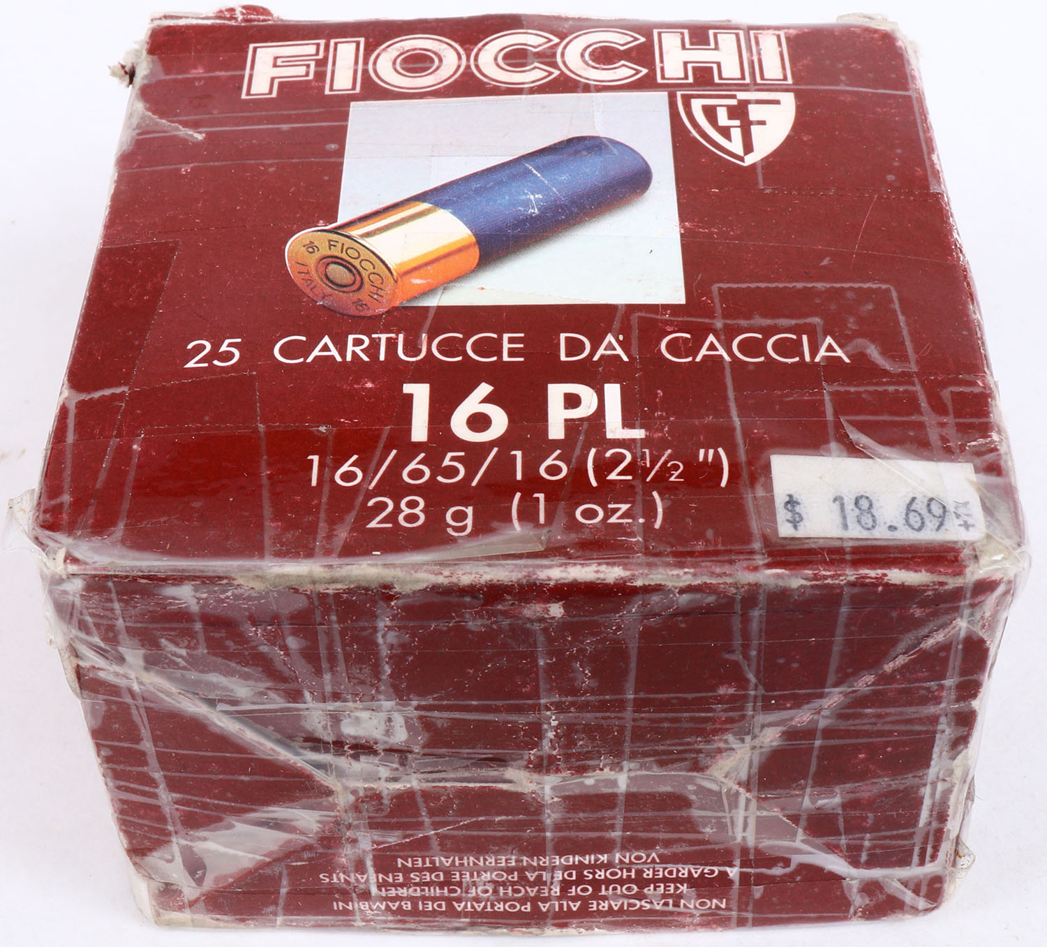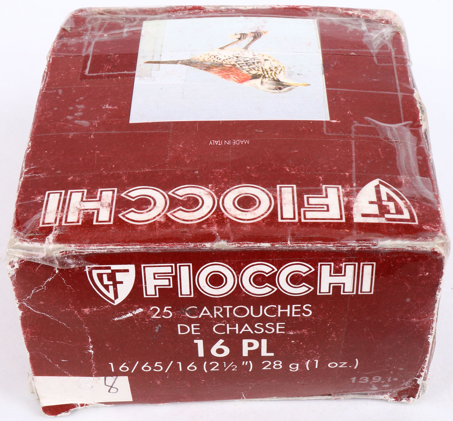 Fiocchi, 16ga., 1pc., Partial 23rds, shot size 8, multi-colored box, box has tape repair, shells are excellent. Grade: Excellent + - Value: 8 to 20