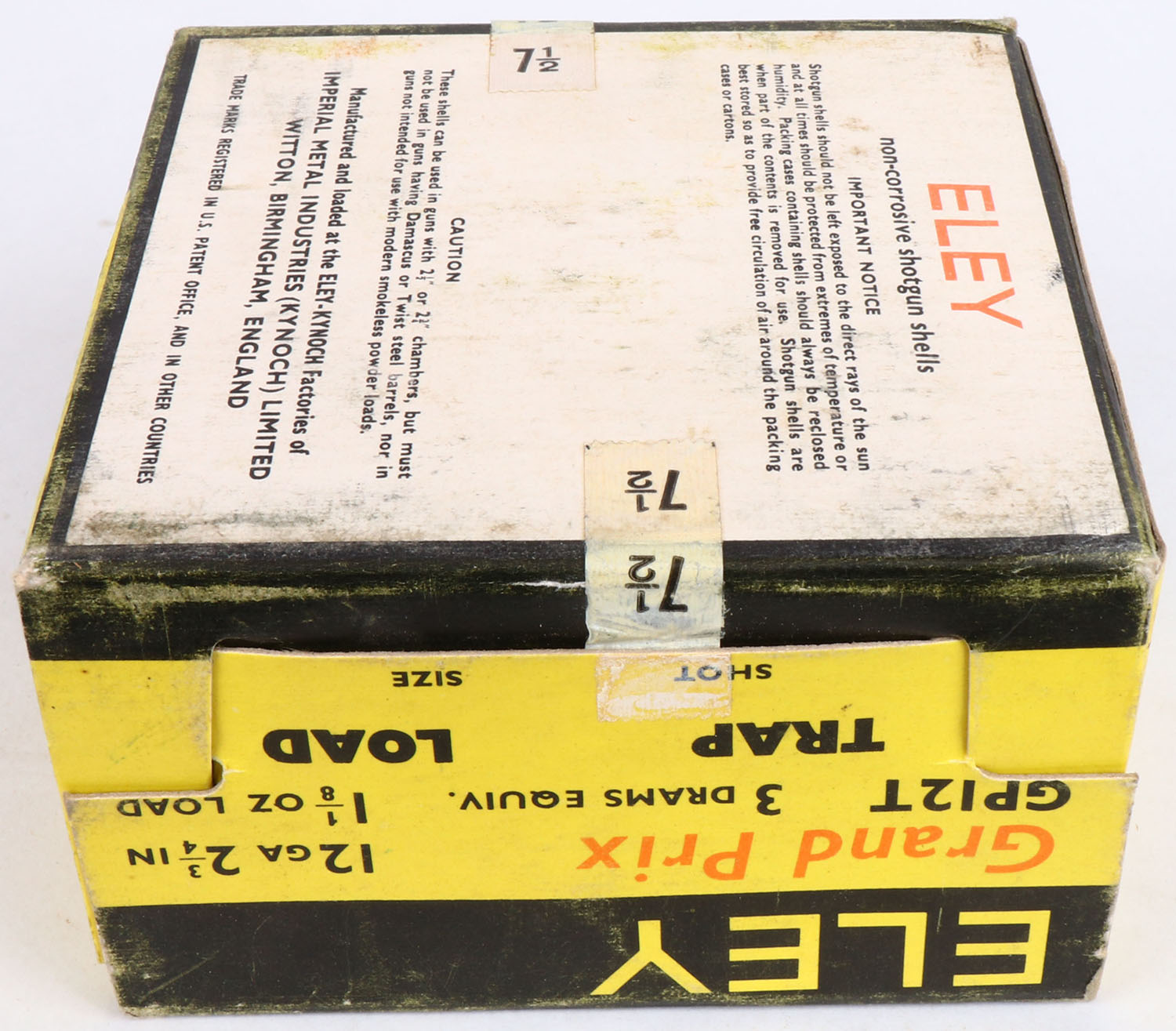 Eley, 12ga., 1pc., Full, shot size 7 1/2 Trap Load, multi-colored box, box is very solid, Shells are excellent. Grade: Excellent + - Value: 10 to 20