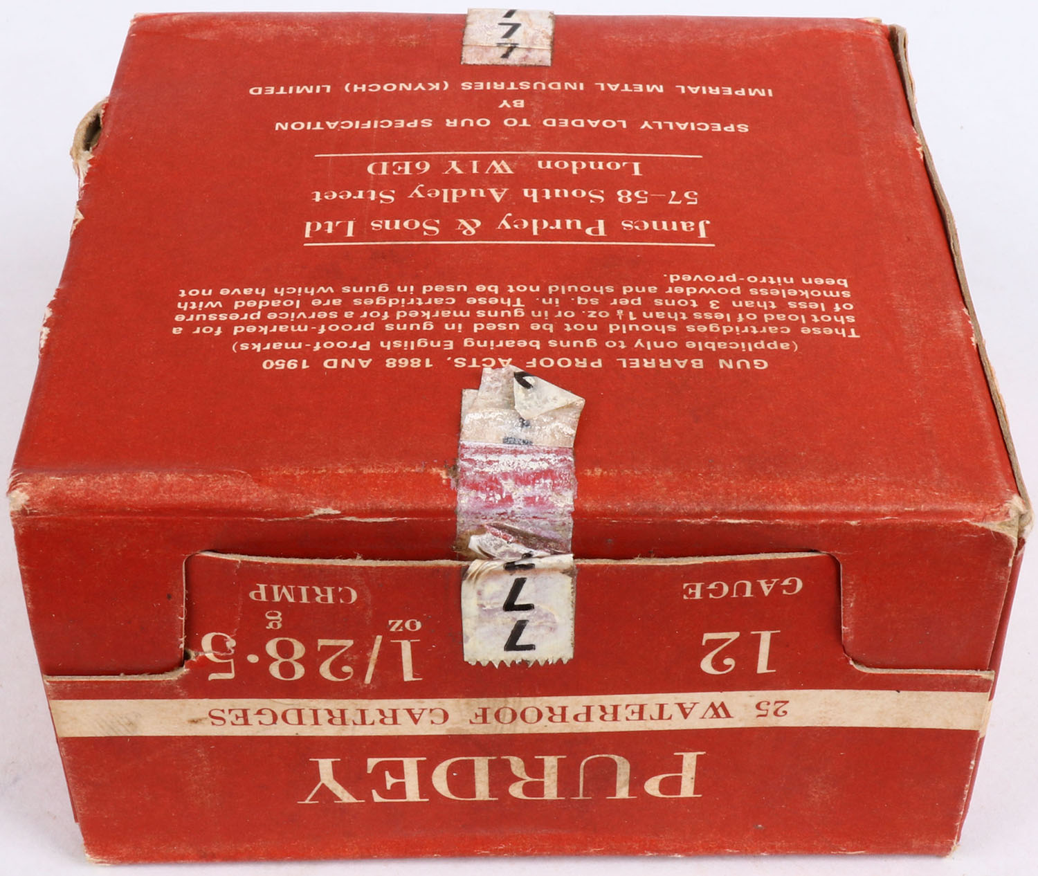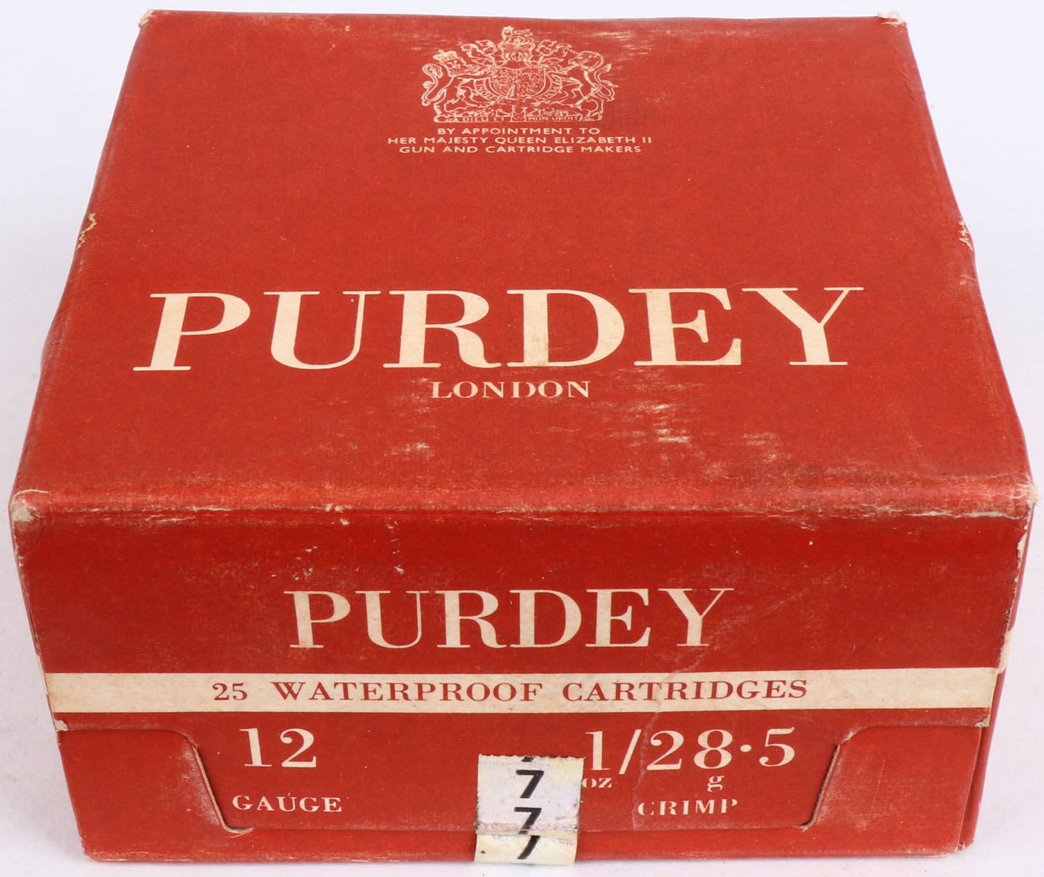 Purdey, 12ga., 1pc., Full, shot size 7, multi-colored box, box is solid, Shells are excellent. Grade: Excellent + - Value: 10 to 20