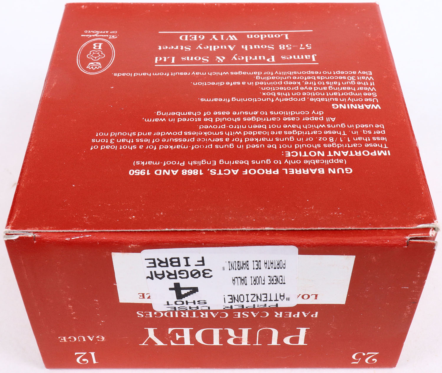 | Purdey, 12ga., 1pc., Full, shot size 4, multi-colored box, box i...