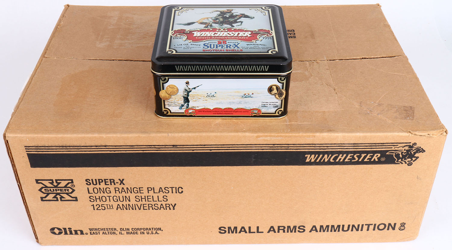 Winchester, Super-X 125th ANNIVERSARY, Case of 12 Tins in original Case, 300rds, 1866-1991, 12ga., 1pc., FULL, shot size 6, box is solid, Shells are excellent. Grade: MINT - Value: 400 to 1000