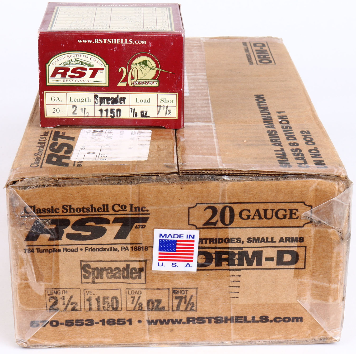 RST, 20ga., 1pc., Full case of 10 boxes, 250rds, shot size 7 1/2, box is very solid, Shells are excellent. Consignor mentioned these were okay for Damascus barrels. Grade: Excellent + - Value: 50 to 150