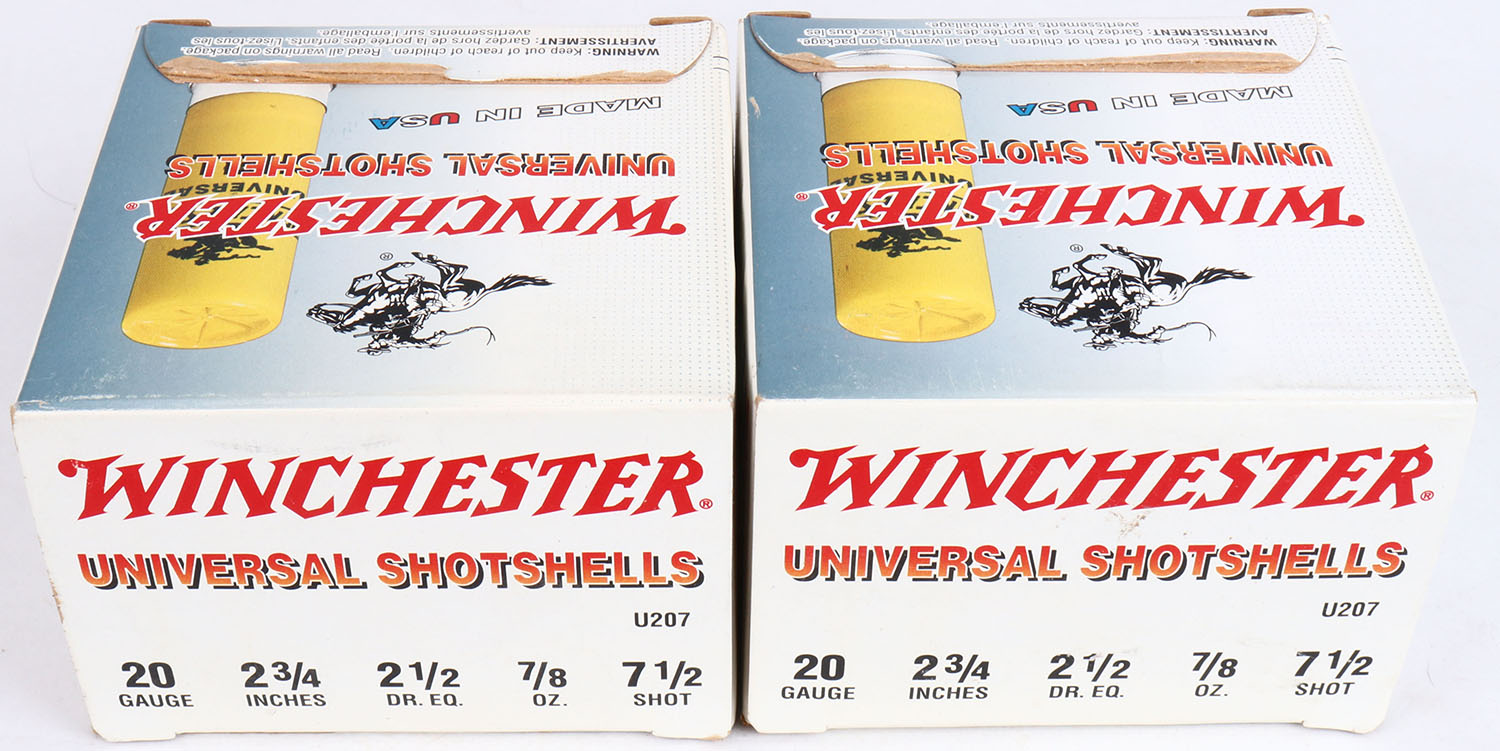 Lot of 2 Winchester Universal, 20ga., 1pc., Appears Full, 2 3/4'', shot size 7 1/2, multi-colored box, shells are excellent. Grade: Excellent + - Value: 10 to 20