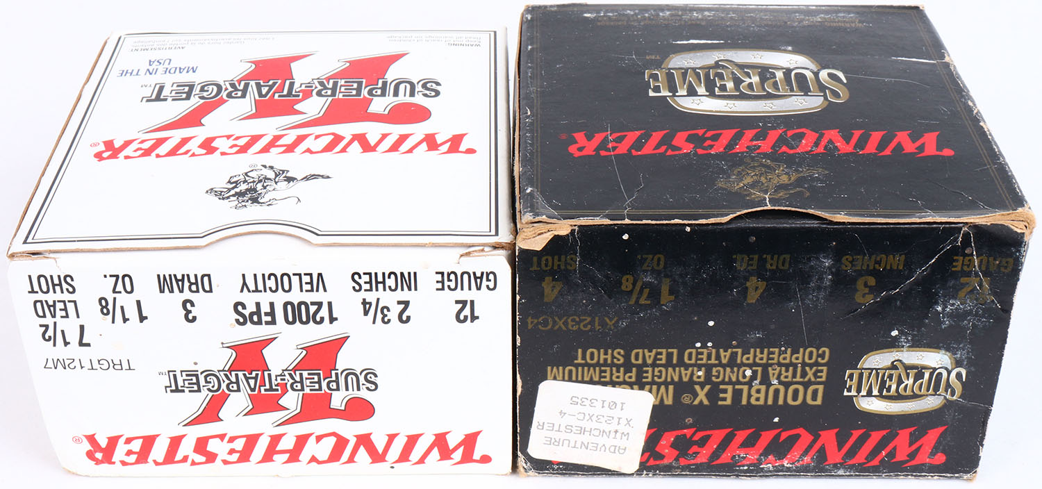 Lot of 2 Winchester, 12ga., 1pc., Appears Partial, 2 3/4 & 3'', shot size 7 1/2 & 4, multi-colored box, shells are excellent. Grade: Excellent + - Value: 8 to 20