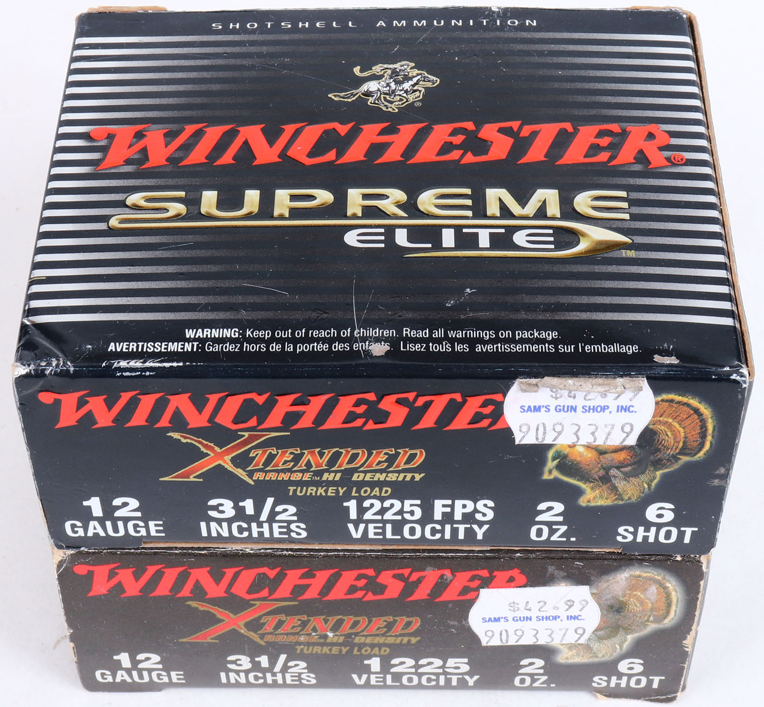 Lot of 2 Winchester Supreme Elite, Turkey Loads, 12ga., 1pc., Full, 3 1/2'', shot size 6, multi-colored box, shells are excellent. Grade: Excellent + - Value: 10 to 20