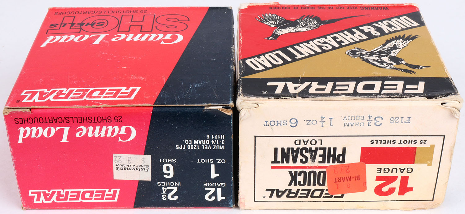 Lot of 2 Federal Game Load & Duck & Pheasant Load, 12ga., 1pc., Appears Partial, 2 3/4'', shot size 6, multi-colored box, shells are excellent. Grade: Excellent + - Value: 10 to 20