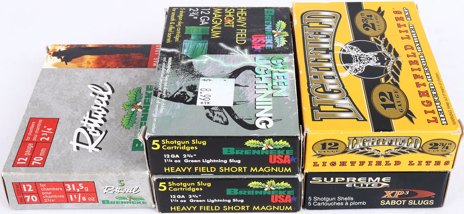 Lot of 5 many different brands, 12ga., 1pc., Appears Partial, 2 3/4'', shot size Slugs, multi-colored box, shells are very good. Grade: Excellent + - Value: 10 to 20