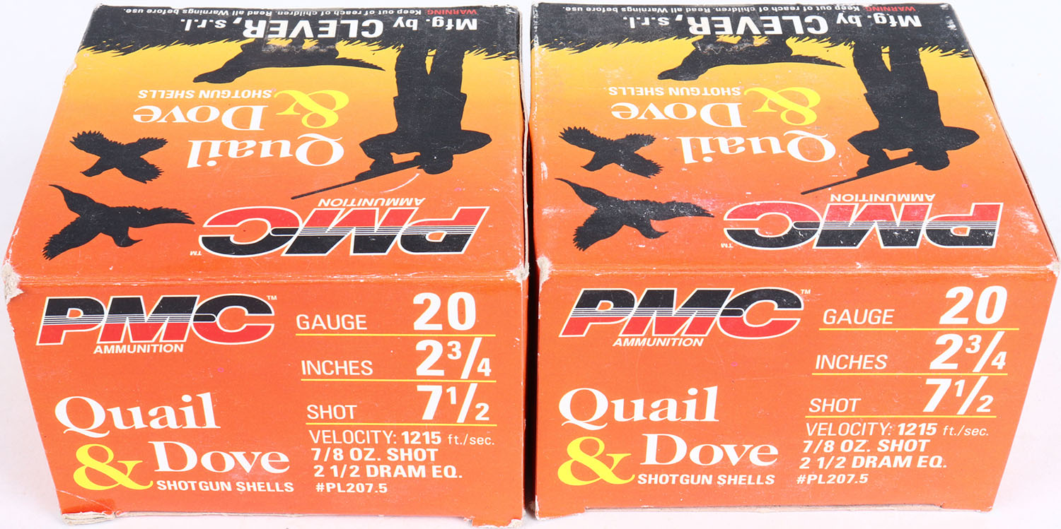 Lot of 2 PMC, Quail & Dove Load, 20ga., 1pc., Appears Full, 2 3/4'', shot size 7 1/2, multi-colored box, shells are excellent. Grade: Excellent + - Value: 10 to 20