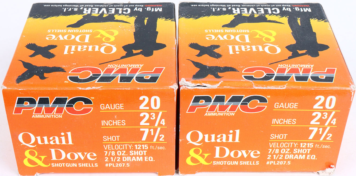 Lot of 2 PMC, Quail & Dove Load, 20ga., 1pc., Appears Full, 2 3/4'', shot size 7 1/2, multi-colored box, shells are excellent. Grade: Excellent + - Value: 10 to 20
