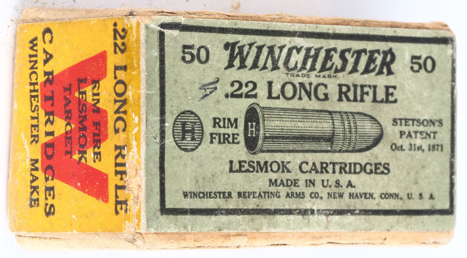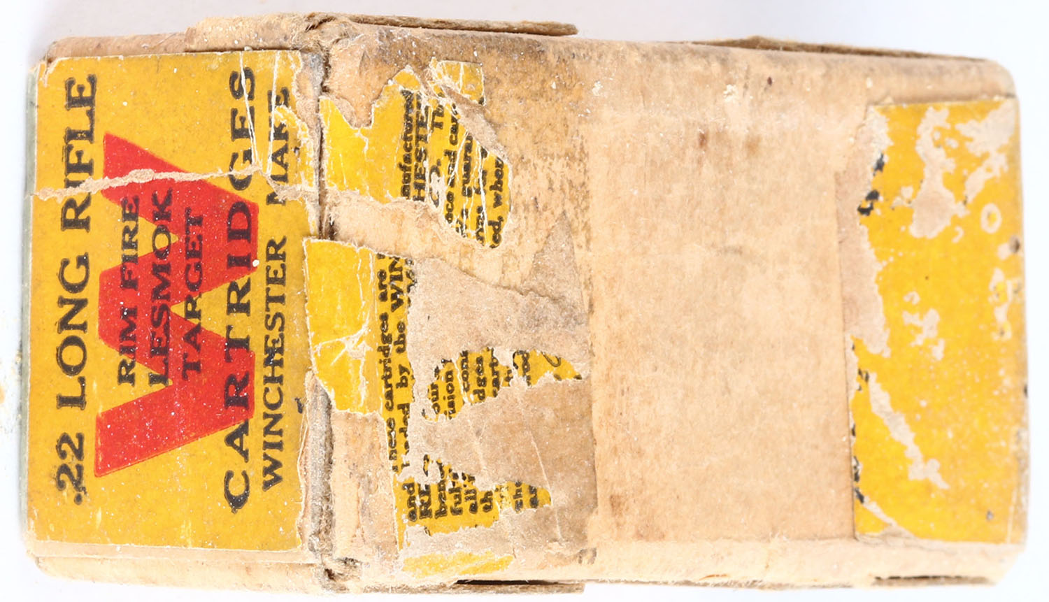 Winchester, .22 Long Rifle, Lesmok Cartridges, RR: WRA-181 LR-66a, Full, 2pc. Buff box with green & yellow wraparound label, box is solid with excellent color, very minor age soiling, edge & corner wear, partial seam split to bottom right edge, small vertical tear to back right corner of lid, top has been written on, labels are intact, ammo is fair to good. Grade: Very Good + - Value: 10 to 50
