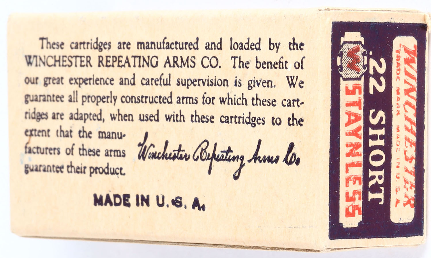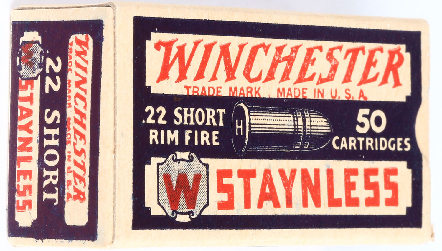 Winchester, Staynless, .22 Short, RHWeb: WRA-12B S-1b, Full, 1pc. Blue white & red box, box is near mint with excellent to minty color, only very minor age soiling and corner wear on one corner, corners are sharp, edges are crisp, end flaps are solid, ammo is good to very good. Grade: Excellent ++ - Value: 70 to 200