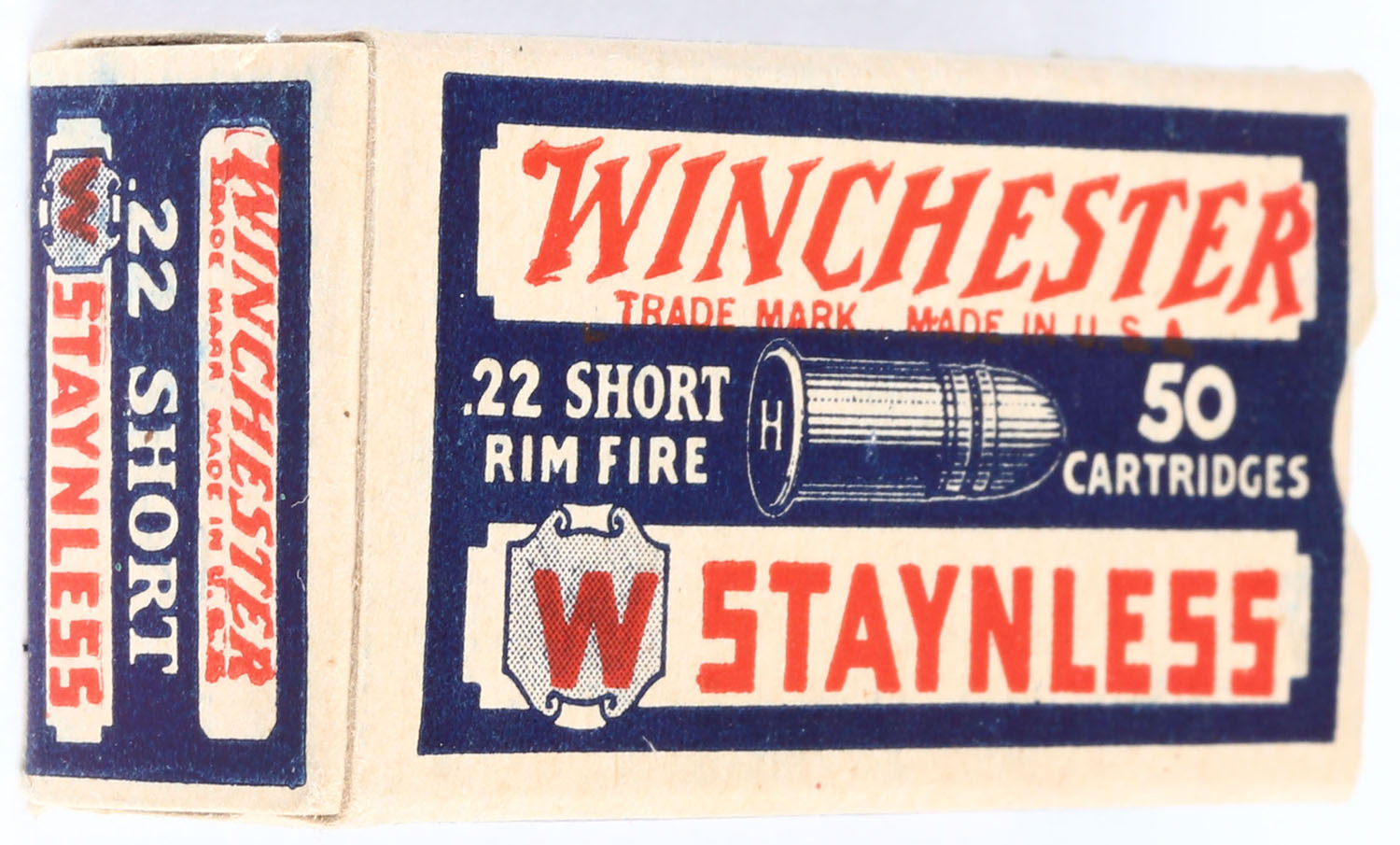Winchester, Staynless, .22 Short, WRA-12B S-1b, Full, 1pc. Blue white & red box, box is solid with excellent color, only very minor age soiling & corner wear, edges are crisp, end flaps are rigid, very minor color bleeding on bottom, ammo is excellent. Grade: Excellent ++ - Value: 70 to 200