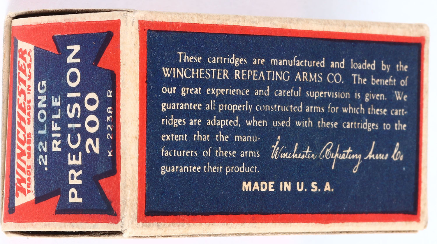 Winchester, Precision 200, .22 Long Rifle, Lesmok, RHWeb: WRA-53 LR-11e, Full, 1pc. Blue red & white box, box is solid with excellent colors, age soiling, very minor edge & corner wear, ammo is excellent. Grade: Excellent + - Value: 100 to 200