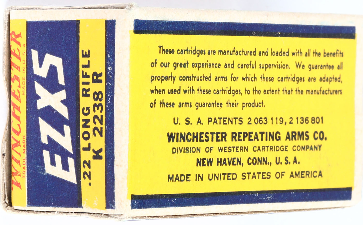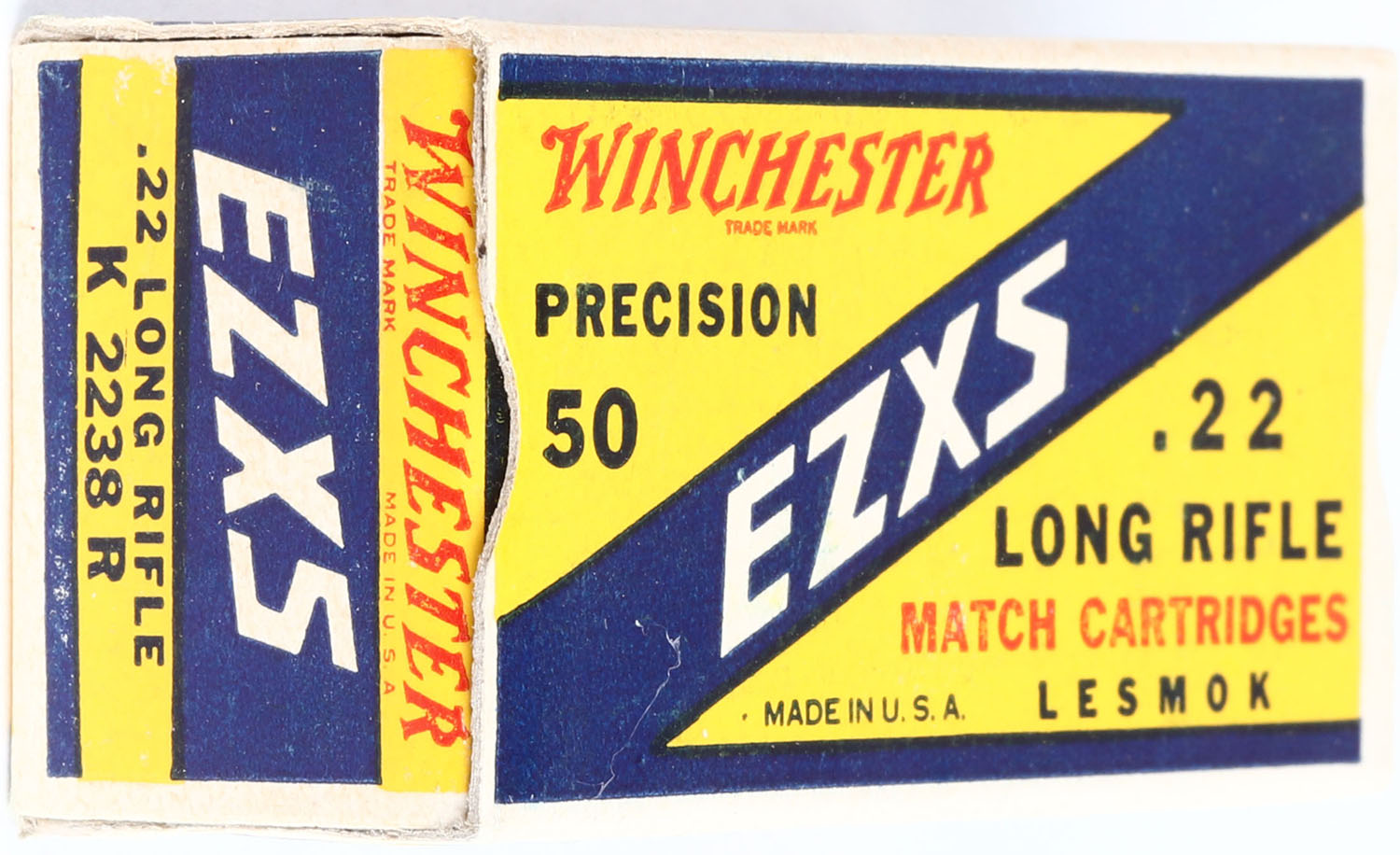Winchester, EZXS, .22 Long Rifle, Supreme Accuracy Match Cartridges, RHWeb: WRA-54 LR-3c, Full, 1pc. Yellow & blue box, box is near mint with minty color, only very minor corner wear on 2 corners, corners are otherwise sharp, edges are crisp, end flaps are rigid, ammo is excellent. Grade: Excellent ++ - Value: 30 to 150