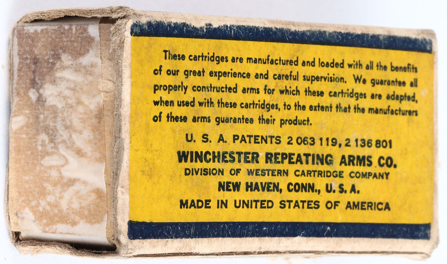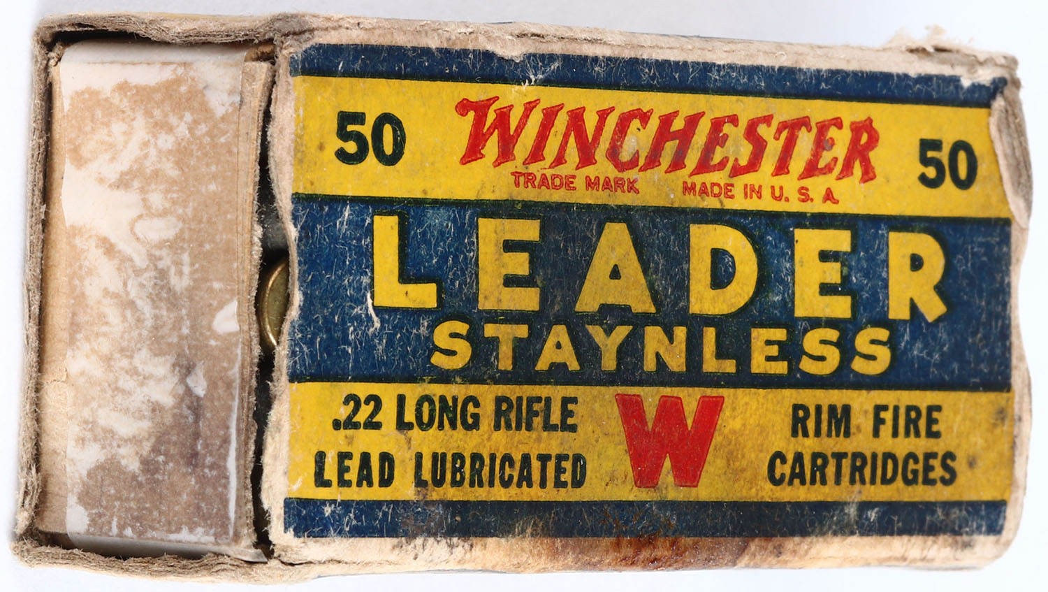 Winchester, Leader Staynless, .22 Long Rifle, RHWeb: WRA-55 LR-1c, Full, 1pc. Yellow blue & red box, box is missing left end flap, age soiling, edge & corner wear, right end flap is solid, ammo is very good. Grade: Good + - Value: 4 to 40