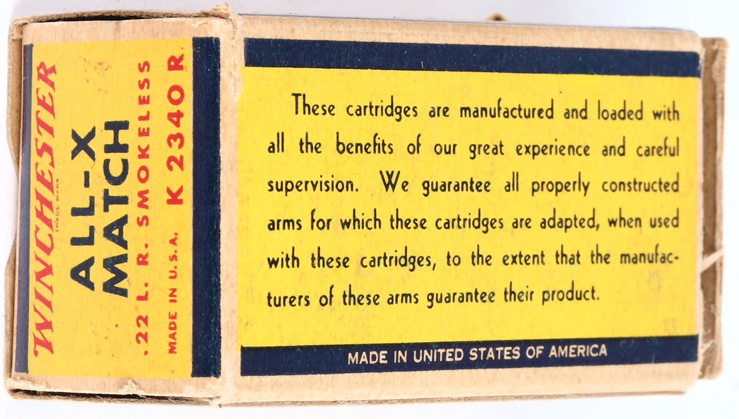Winchester, All-X Match, .22 Long Rifle, Smokeless, RHWeb: WRA-54 LR-1, Full, 1pc. Yellow red & blue box, right end flap is torn, box has excellent color, some age soiling, partial seam split to top front edge, very minor corner wear, edges are mostly crisp, left end flap is solid, ammo is very good. Grade: Very Good + - Value: 30 to 120