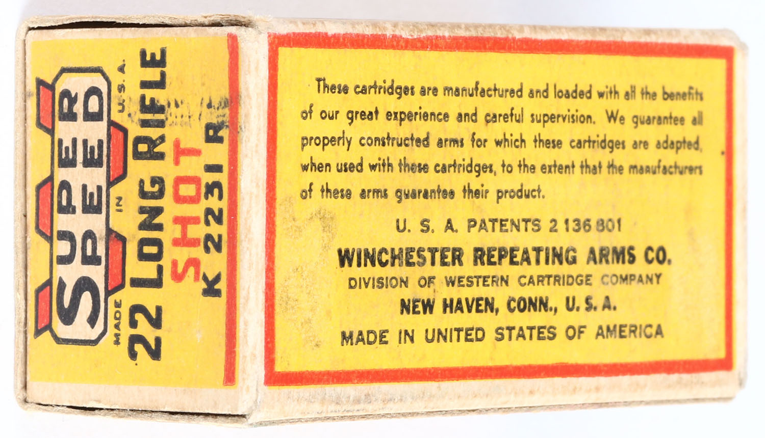 Winchester, Super Speed, .22 Long Rifle Shot, Staynless, RHWeb: WRA-14B LR-5, Full, 1pc. Yellow red & blue box, box is solid with very good to excellent color, minor age soiling, very minor edge & corner wear, end flaps are fairly rigid, ammo is excellent. Grade: Excellent + - Value: 100 to 300