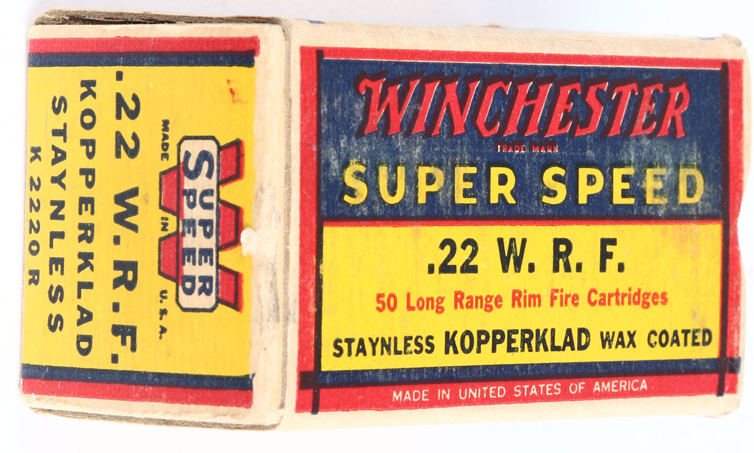 Winchester, Super Speed, .22 W.R.F., Staynless KopperKlad Wax Coated, RHWeb: WRF-1b, Full, 1pc. Yellow blue & red box, box is solid with excellent color, minor age soiling & shelf wear, very minor corner wear, edges are crisp, end flaps are rigid, ammo is excellent. Grade: Excellent + - Value: 20 to 60