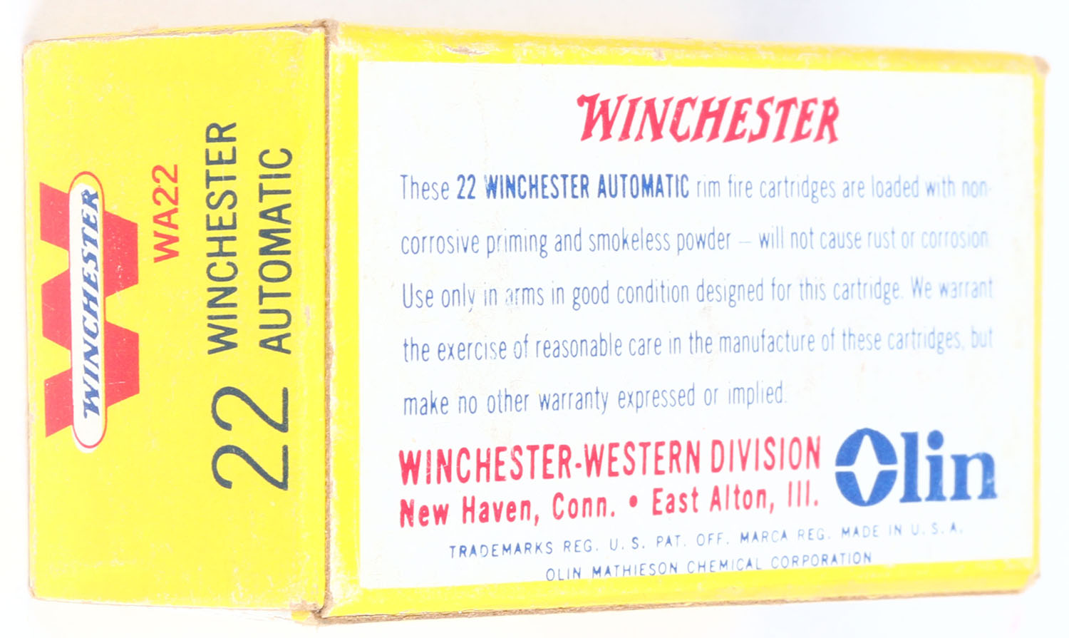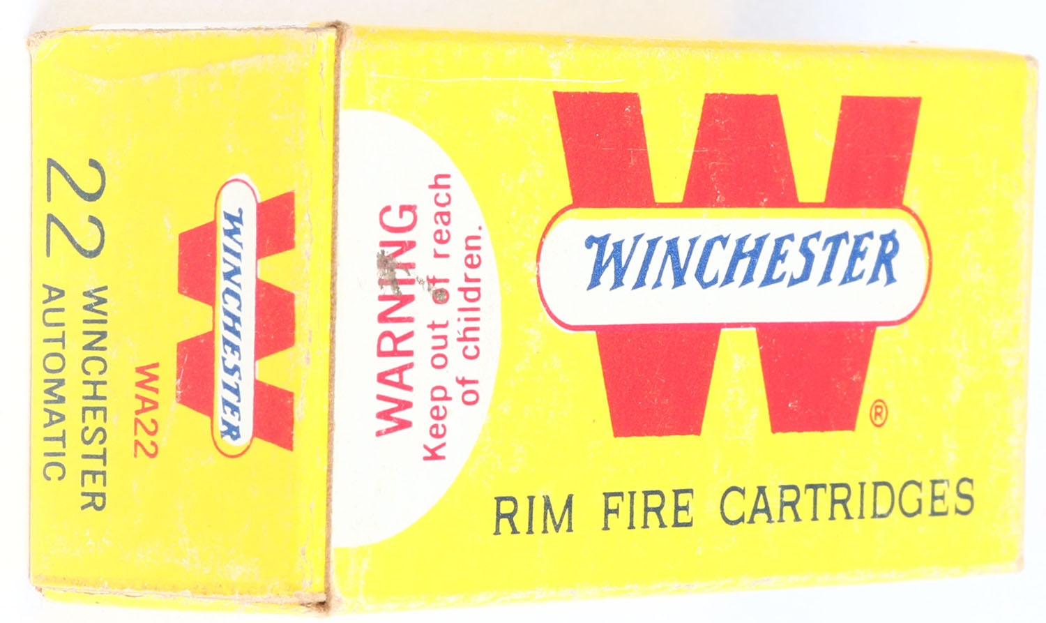 Winchester, .22 Winchester Automatic, RHWeb: WRA-20 WA-1, Full, 1pc. Yellow white & red box, box is solid with excellent color, very minor shelf & corner wear, minor edge wear, end flaps are solid, ammo is minty. Grade: Excellent + - Value: 20 to 80