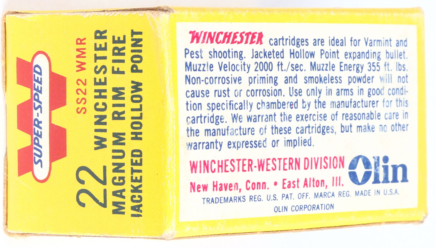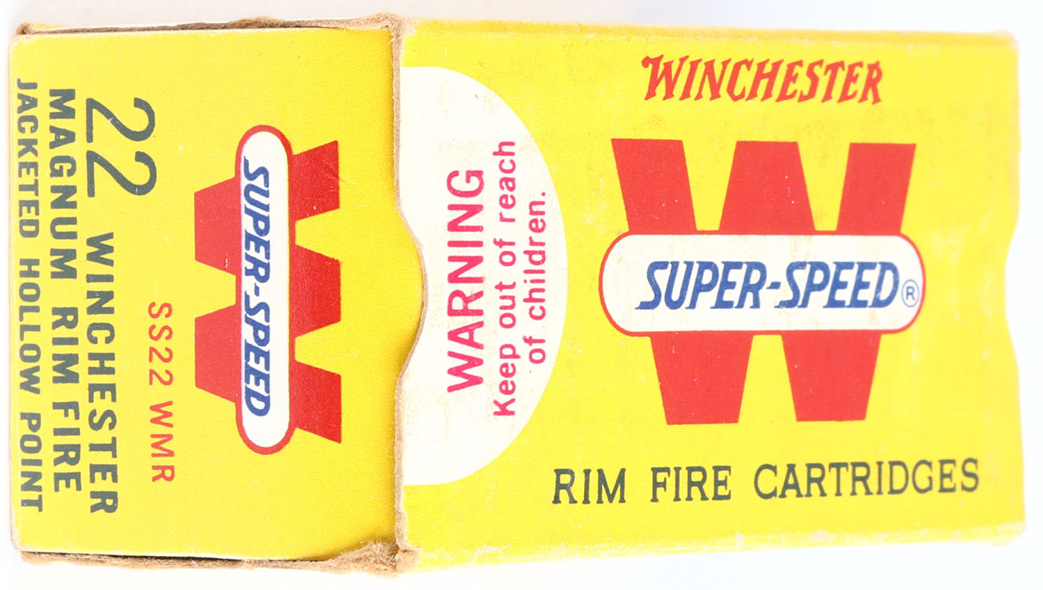 Winchester, Super-Speed, .22 W.M.R., 40 Gr. Jacketed Hollow Pint, RHWeb: WRA-20 WMR-2c, Full, 1pc. Yellow white & red box, box is solid with excellent color, very minor shelf wear, very minor corner wear, edges are mostly crisp, end flaps are rigid, ammo is excellent. Grade: Excellent ++ - Value: 10 to 40