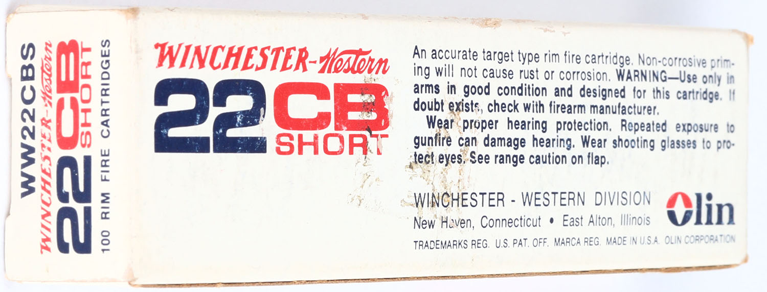 Winchester-Western, .22 CB Short, Low Velocity, Reduced Charge, RHWeb: WW-1 C-B-1, 100rds. Full, 1pc. White red & blue box, box is solid with excellent color, minor edge & corner wear, very minor shelf wear, end flaps are solid, ammo is excellent to minty. Grade: Excellent + - Value: 10 to 50