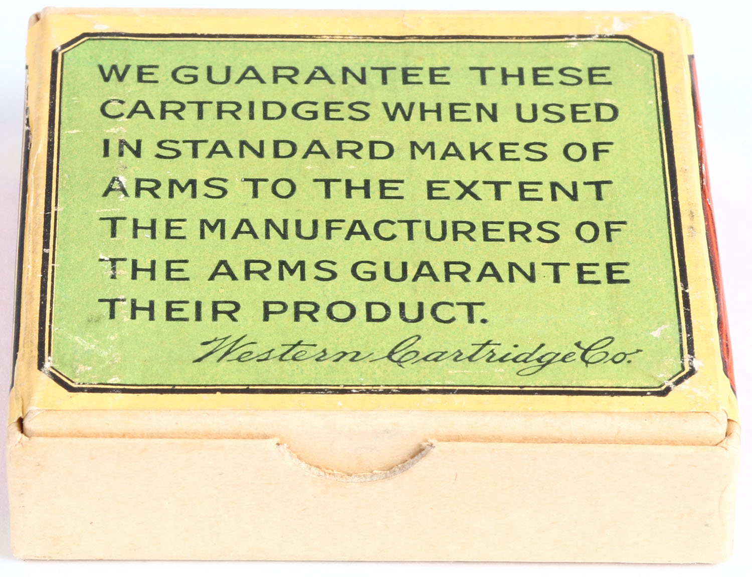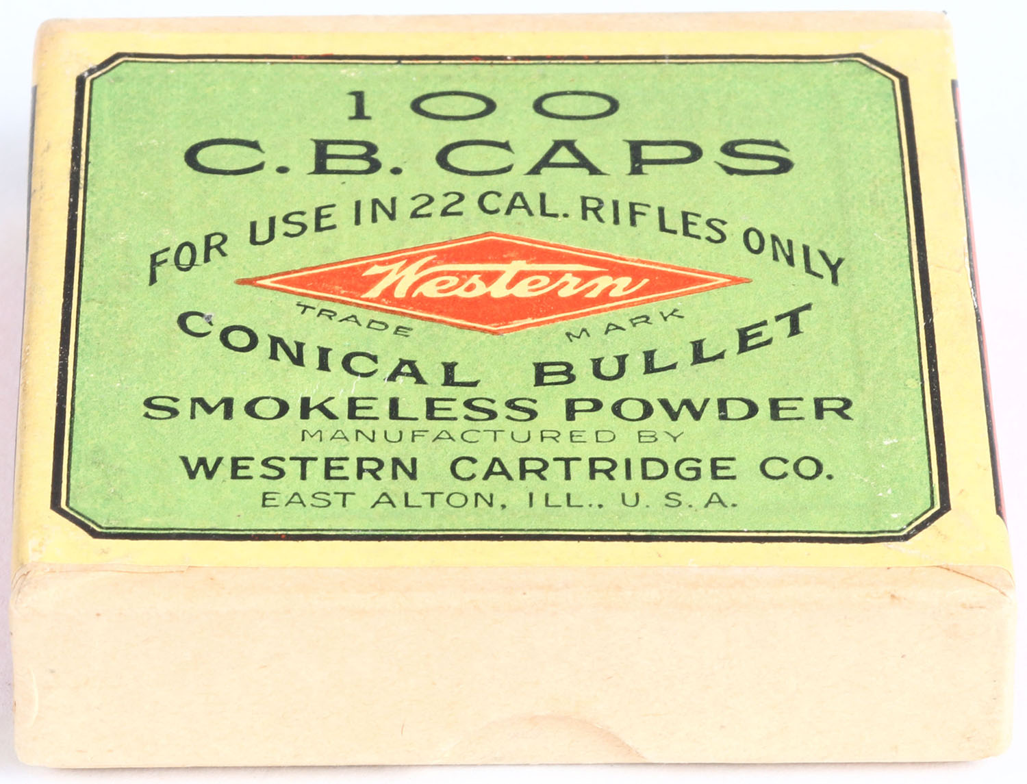 Rare! Western, .22 C.B. Caps, Smokeless Powder, No Grease, RHWeb: WCC-3 CB-2, FULL & SEALED, 2pc. Buff box with green red & cream colored wraparound label, box is solid with excellent to minty color, only very minor shelf wear, edges are crisp, corners are sharp, label is intact. Grade: Excellent ++ - Value: 200 to 600