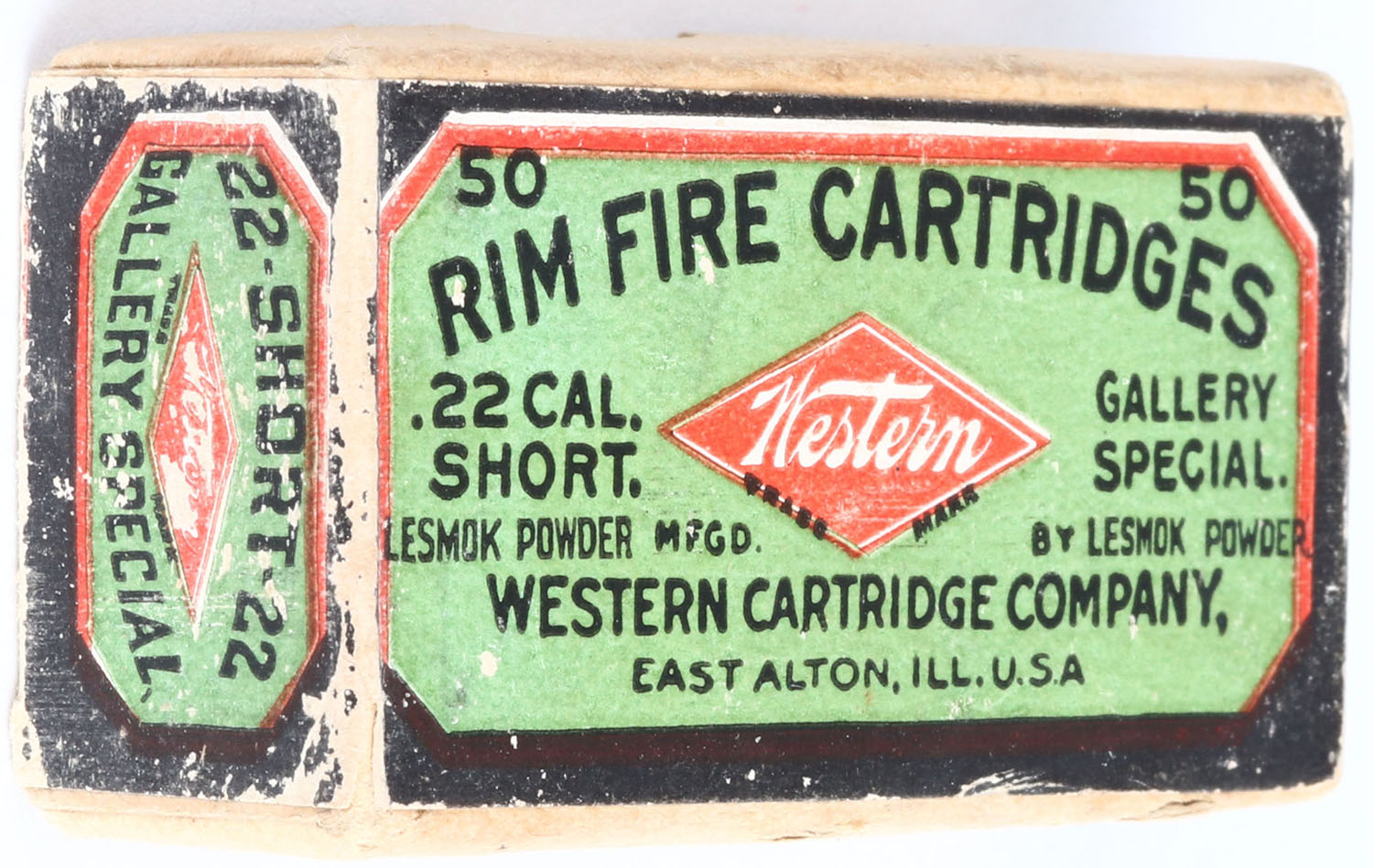 Western, .22 Short Gallery Special, Lesmok Powder, RHWeb: WCC-48 S-4, Full, 2pc. Buff box with green red & blue wraparound label, box is solid with excellent color, some shelf & edge wear, very minor corner wear, label is 99% intact, ammo is very good. Grade: Excellent + - Value: 30 to 150