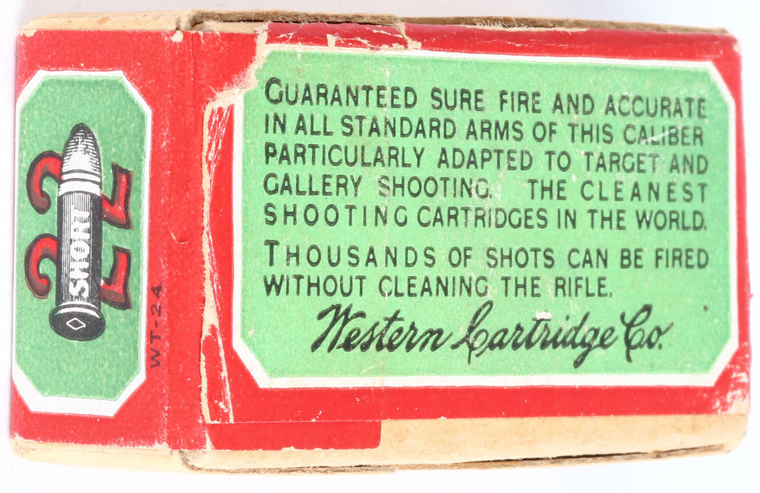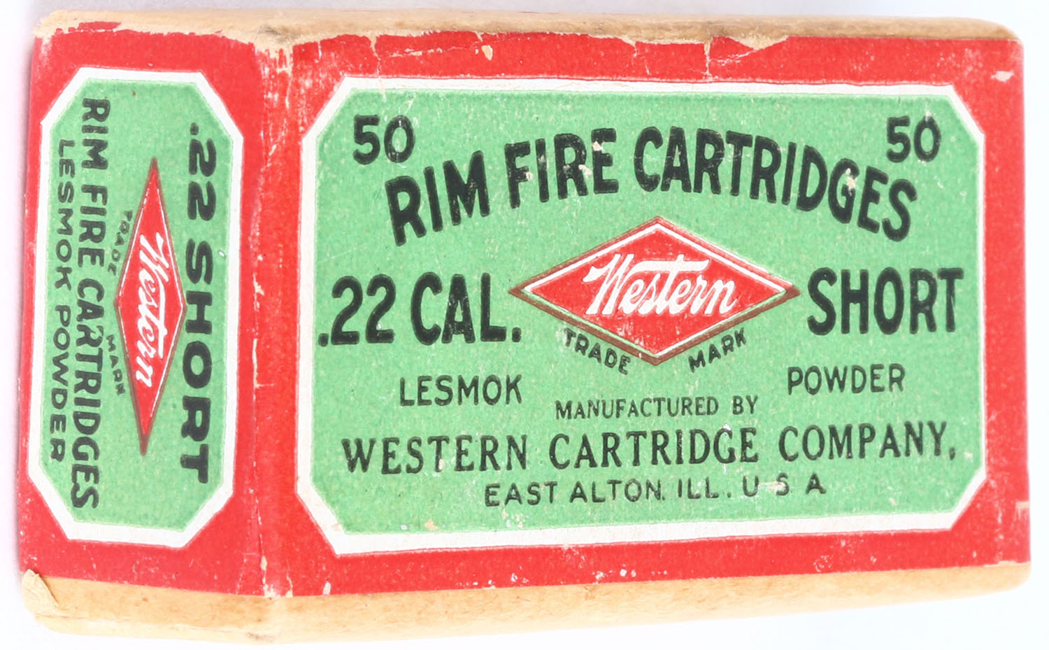 Western, .22 Short, Lesmok Powder, RHWeb: WCC-3 S-2b, FULL & SEALED, 2pc. Buff box with green & red wraparound label, box is solid with excellent to minty color, very minor shelf wear, edges are crisp, corners are mostly sharp, label is intact. Grade: Excellent ++ - Value: 100 to 200