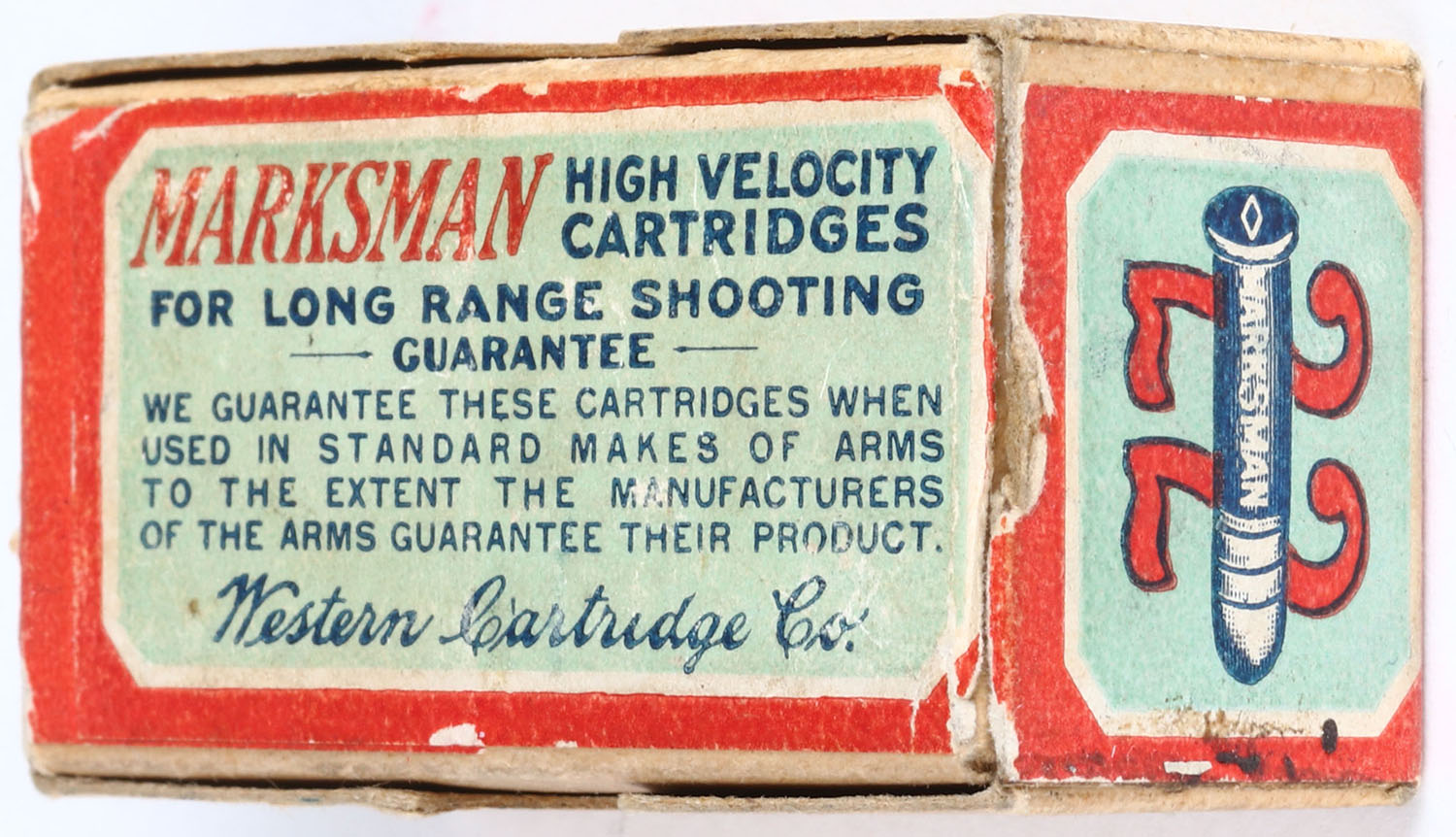 Western, Marksman Cartridges, .22 Long Rifle, High Velocity, Lesmok Powder, RHWeb: WCC-50 LR-2, Full, 2pc. Buff box with green & red wraparound label, box is solid with very good color that is somewhat faded, minor age soiling, minor shelf & edge wear, very minor corner wear, label is intact, ammo is very good. Grade: Excellent - Value: 100 to 300