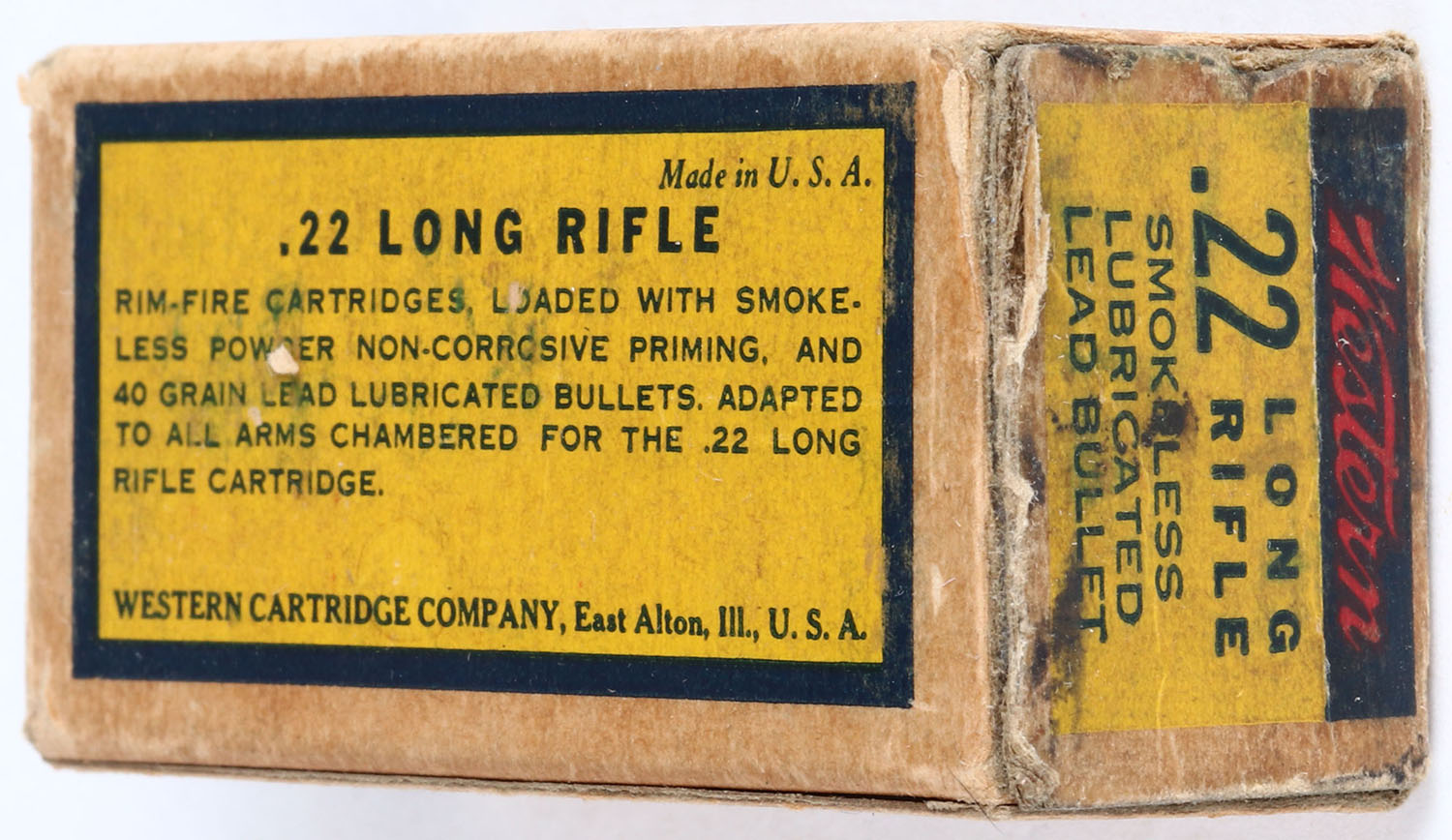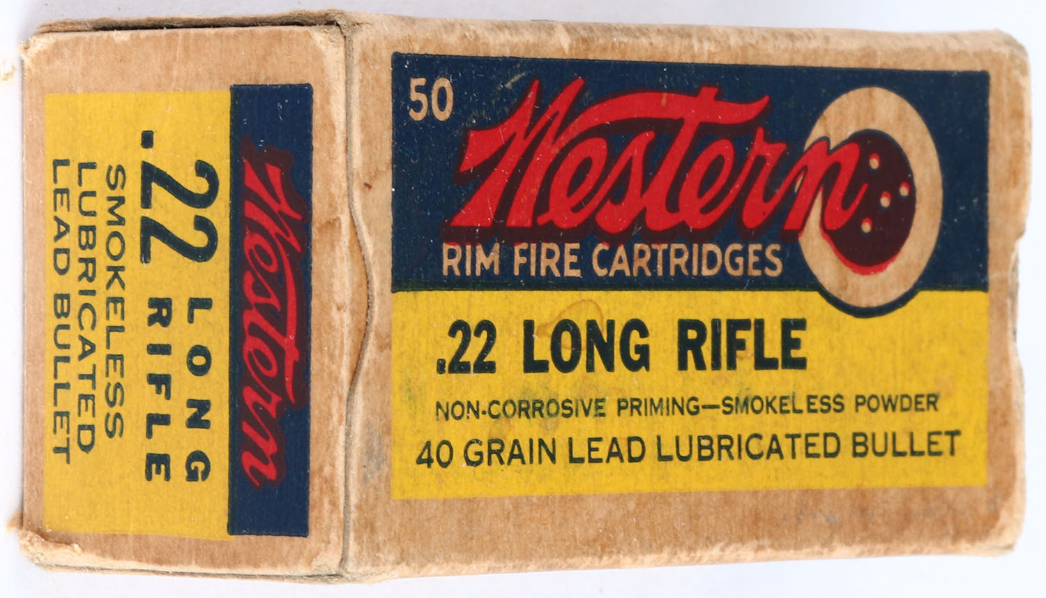 Western, .22 Long Rifle, RHWeb: WCC-4.3B LR-1h, Army Lot 6028 1943, Full, 1pc. Yellow blue & red box, box has very good color, age soiling, right end flap is torn and taped, minor corner wear, very minor edge wear, ammo is very good to excellent. Grade: Very Good + - Value: 8 to 40