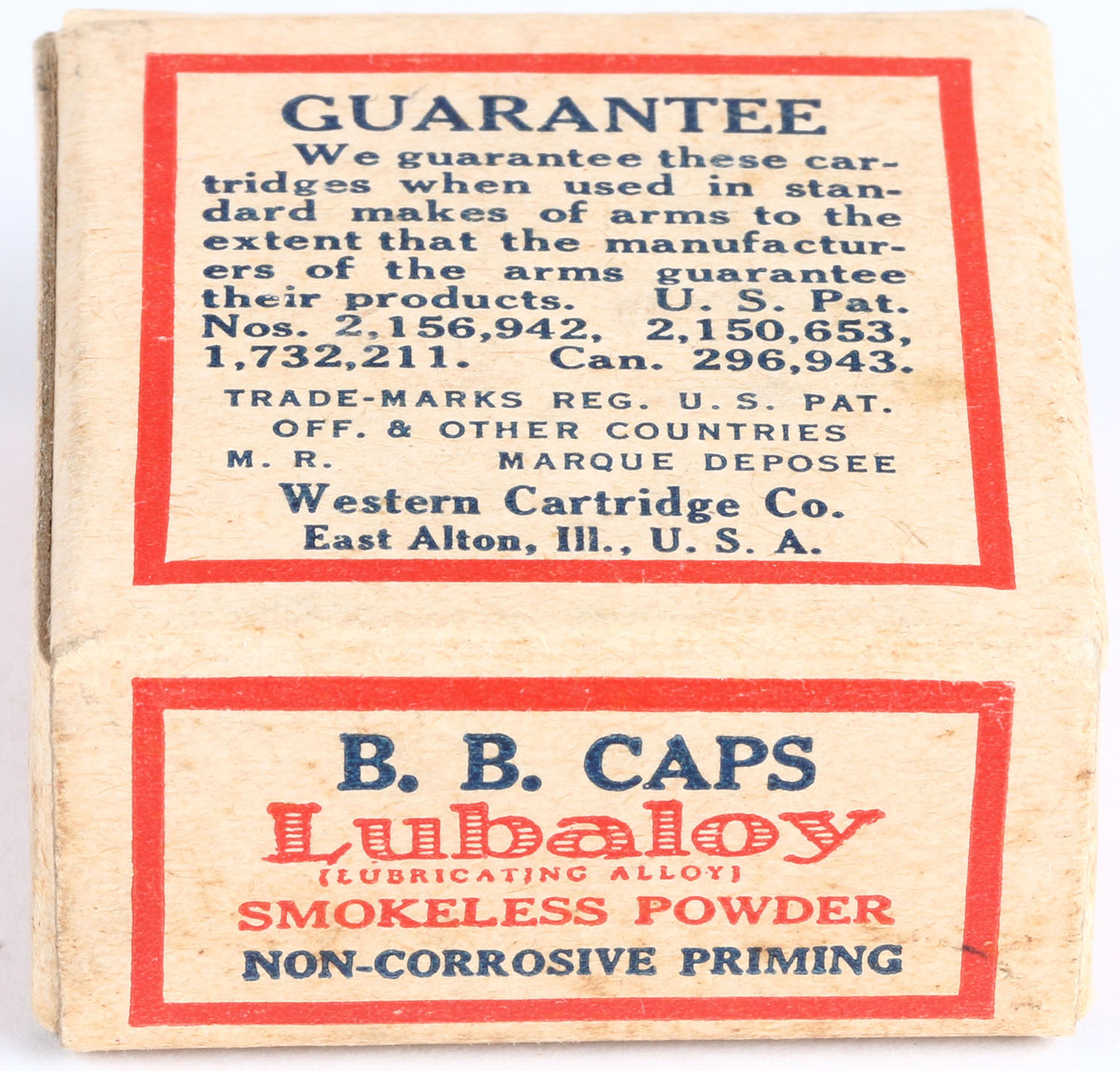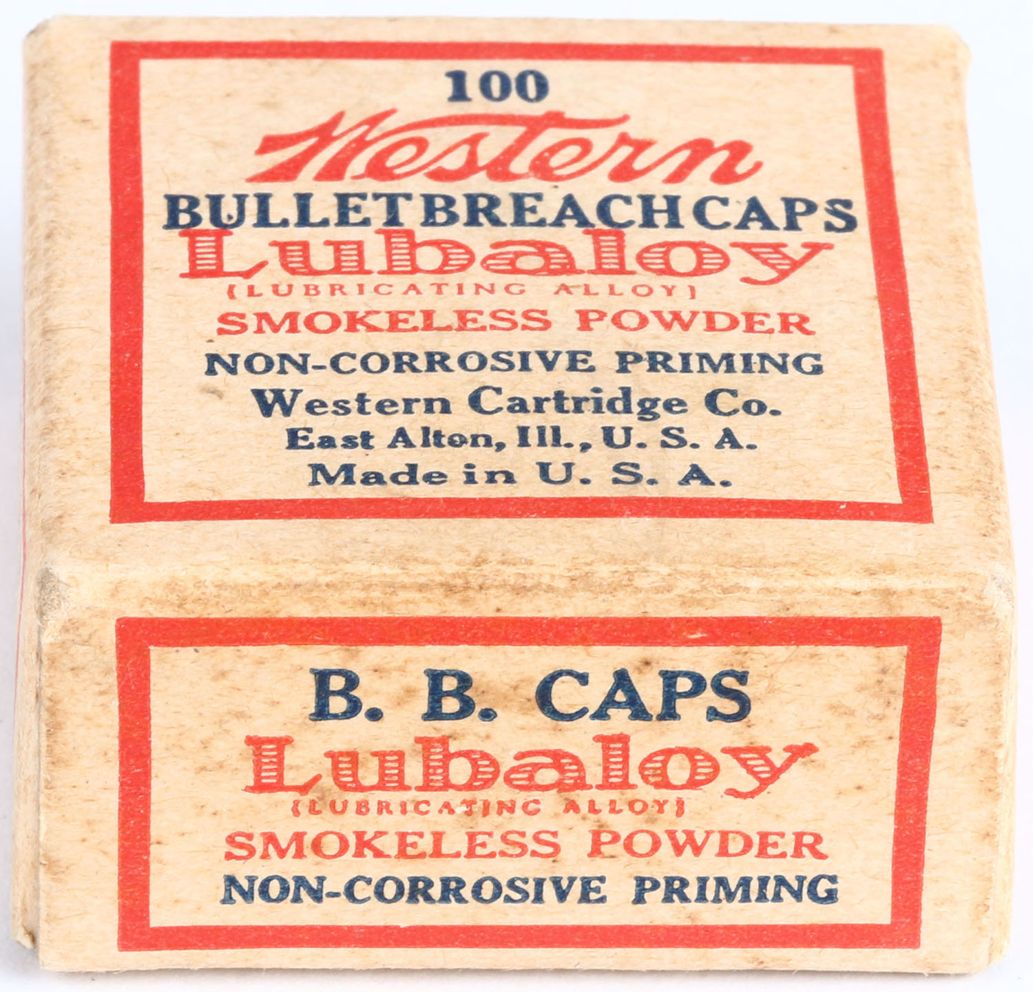 Western, Bullet Breach Caps, Lubaloy, Smokeless Powder, RHWeb: WCC-99 BB-2d, Full, 1pc. Buff box with red & black printing, box is solid with very good to excellent color, some age soiling, minor corner wear, edges are mostly crisp, end flaps are solid, ammo is excellent. Grade: Excellent + - Value: 20 to 60
