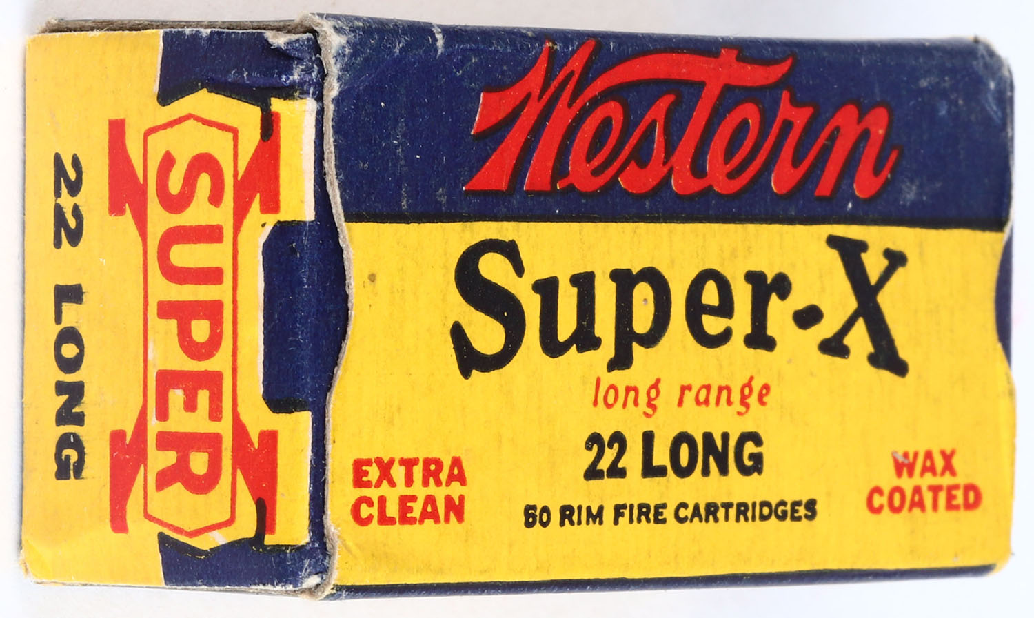 Western, Super-X, .22 Long, Extra Clean Wax Coated, RHWeb: (Super-X Longs) WCC-12 L-21, Full, 1pc. Yellow blue & red box, box is solid with excellent color, very minor age soiling & corner wear, edges are mostly crisp, end flaps are solid, ammo is excellent. Grade: Excellent + - Value: 6 to 24