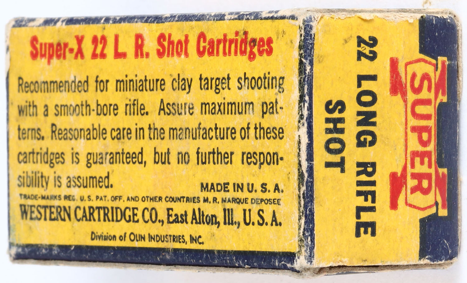 Western, Super-X, Long Rifle Shot, RHWeb: (Super-X Long Rifle) WCC-46 LRS-15, Full, 1pc. Yellow blue & red box, box is solid with excellent color, some edge & corner wear, end flaps are rigid, ammo is excellent. Grade: Excellent + - Value: 8 to 40