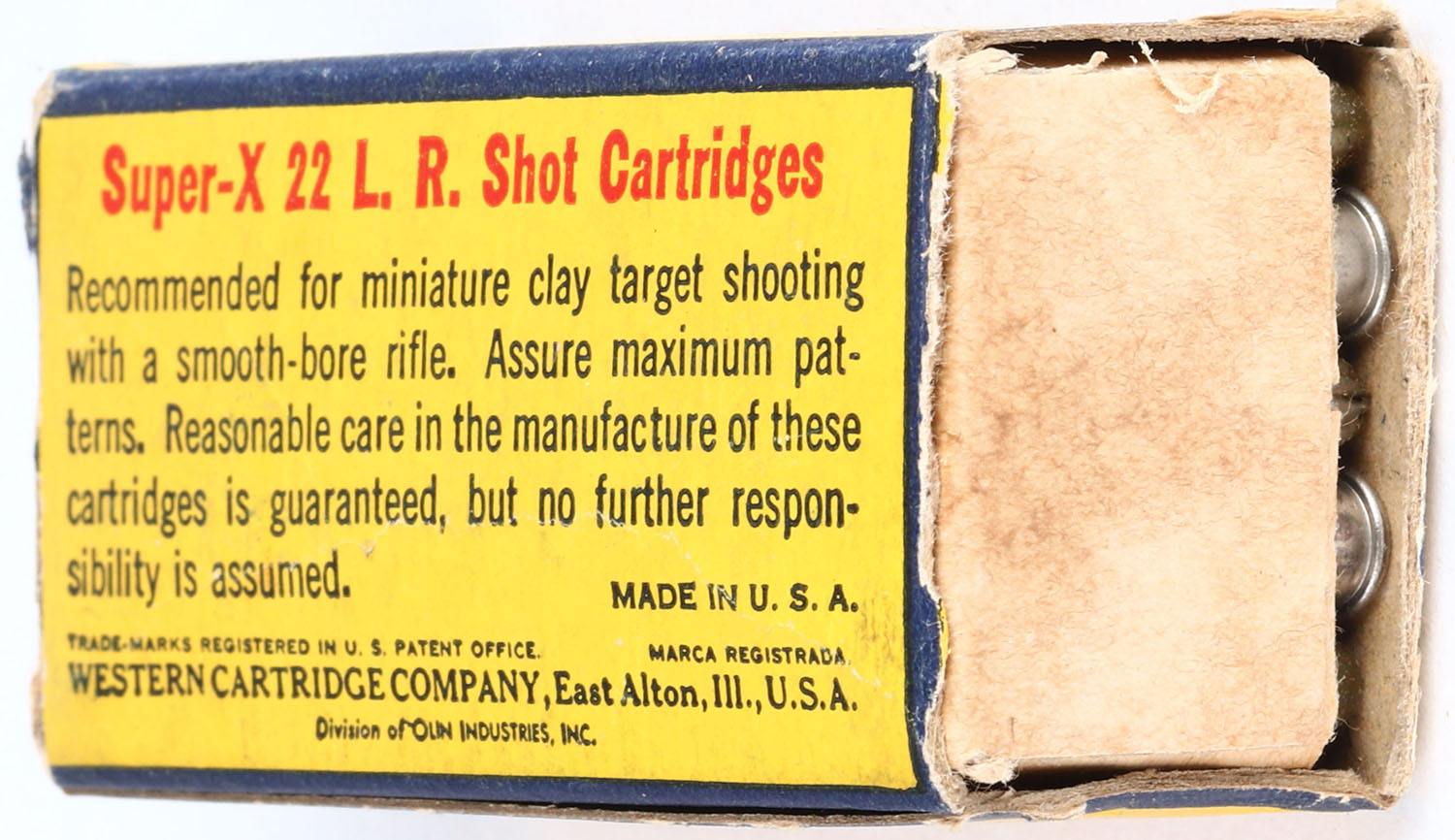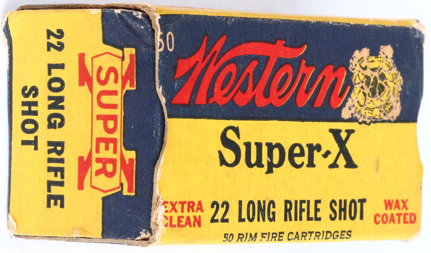 Western, Super-X, Long Rifle Shot, RHWeb: (Super-X Long Rifle) WCC-46 LRS-15, Full, 1pc. Yellow blue & red box, box is solid with excellent color, partial seam split to right end flap, minor corner wear, edges are mostly crisp, left end flap is rigid, ammo is excellent. Grade: Excellent + - Value: 8 to 40