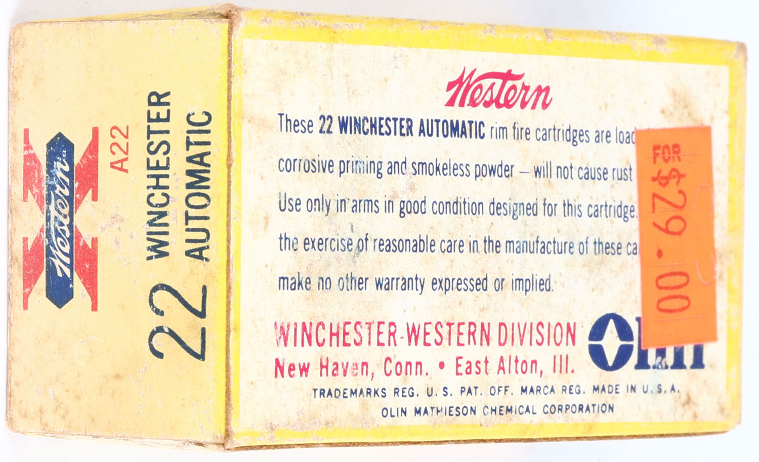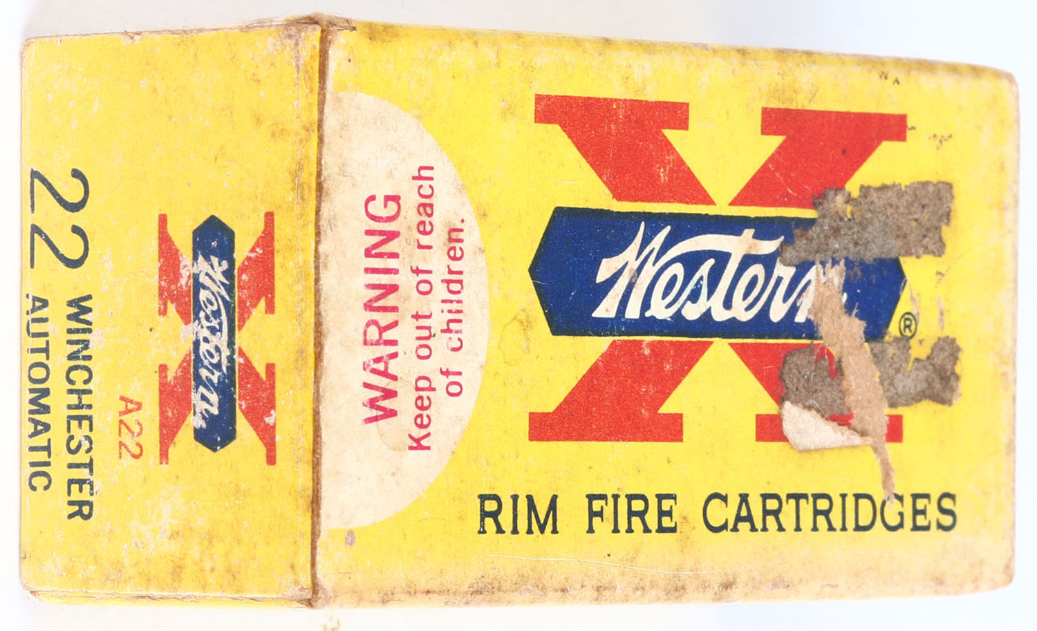Western, X, .22 Win. Auto., RHWeb: WCC-12 WA-1.5, Full, 1pc. Yellow white & red box, box is solid with good to very good color, age soiling, sticker residue on top, sticker on bottom, minor edge & corner wear, end flaps are solid, ammo is excellent. Grade: Very Good + - Value: 10 to 50