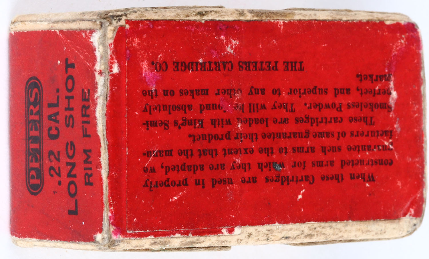 Peters, .22 Long Shot, Chilled Shot, RHWeb: PCC-4 L-6b, Full, 2pc. Buff box with red wraparound label, box is solid with very good to excellent color, some age soiling & shelf wear, minor edge & corner wear, label is intact, ammo is very good. Grade: Excellent - Value: 100 to 200