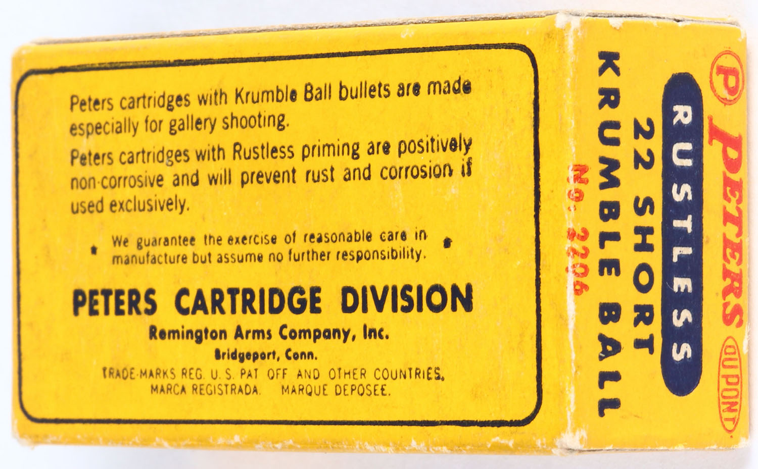 Rare! Peters, Rustless Krumble Ball, .22 Short Gallery Cartridges, RHWeb: PCC-29 S-2b, Full, 1pc. Blue yellow & red box, box is near mint with minty color, only very minor corner wear and the bottom is very slightly soiled, edges are crisp, end flaps are rigid, ammo is excellent. Grade: Excellent ++ - Value: 150 to 300