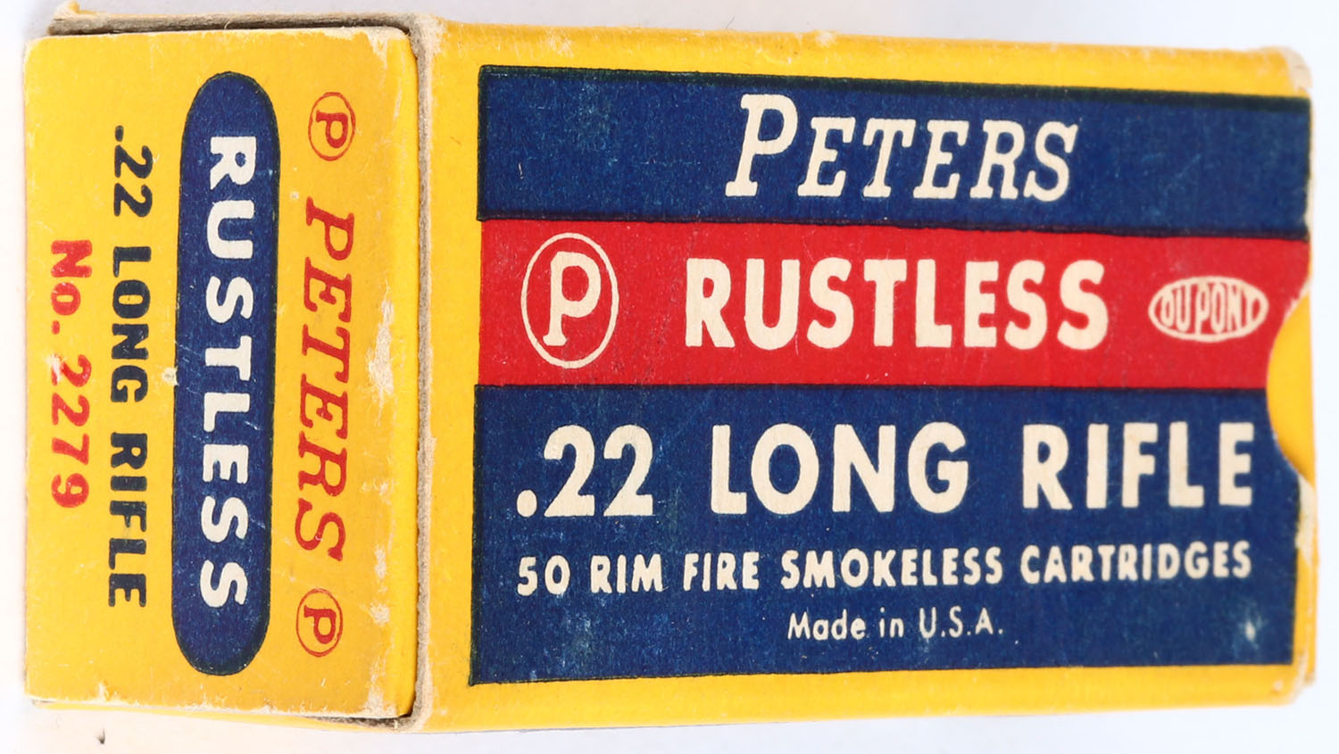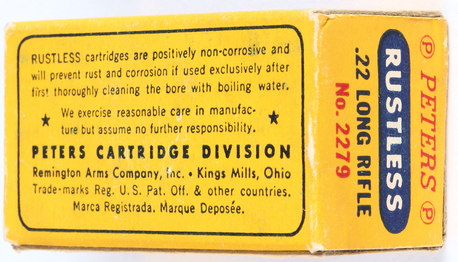 Peters, Rustless, .22 Long Rifle, RHWeb: PCC-8D LR-3f, Full, 1pc. Blue yellow & red box, box is solid with minty color, very minor corner wear, small indent on top, corners are very crisp, end flaps are very rigid, ammo is excellent. Grade: Excellent ++ - Value: 10 to 40