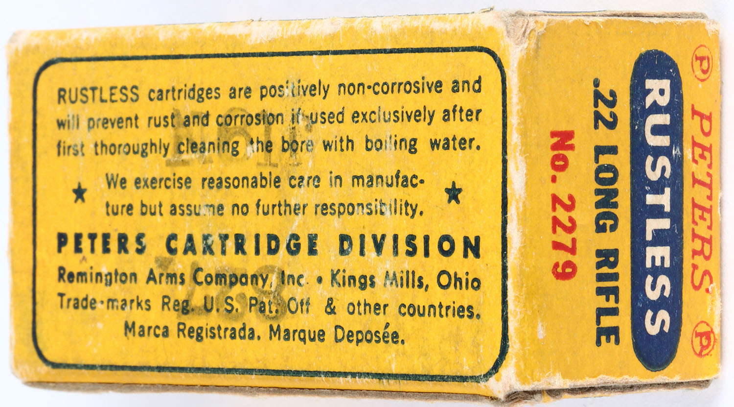 Peters, Rustless, .22 Long Rifle, RHWeb: PCC-8D LR-3f.1, Full, 1pc. Blue yellow & red box, box is solid with excellent color, very minor age soiling & corner wear, edges are mostly crisp, end flaps are rigid, ammo is excellent. Grade: Excellent + - Value: 10 to 40