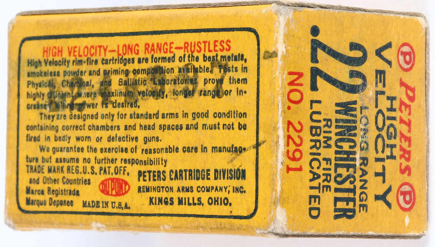 Peters, High Velocity Long Range, .22 Winchester Rim Fire, RHWeb: PCC-11B WRF-4, Full, 1pc. Yellow blue & red box, box is solid with very good to excellent color, some age soiling, minor corner wear, very minor edge wear, end flaps are solid, ammo is very good to excellent. Excellent + - Value: 80 to 300