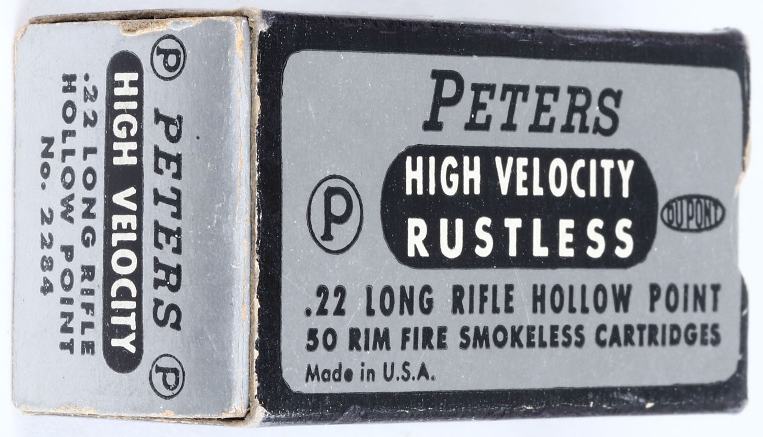 Peters, High Velocity Rustless, .22 Long Rifle Hollow Point, PCC-14 LR-2aa, Full, 1pc. Silver black & white box, box is solid with excellent color, very minor corner wear, edges are mostly crisp, end flaps are mostly rigid, ammo is excellent. Grade: Excellent + - Value: 10 to 40