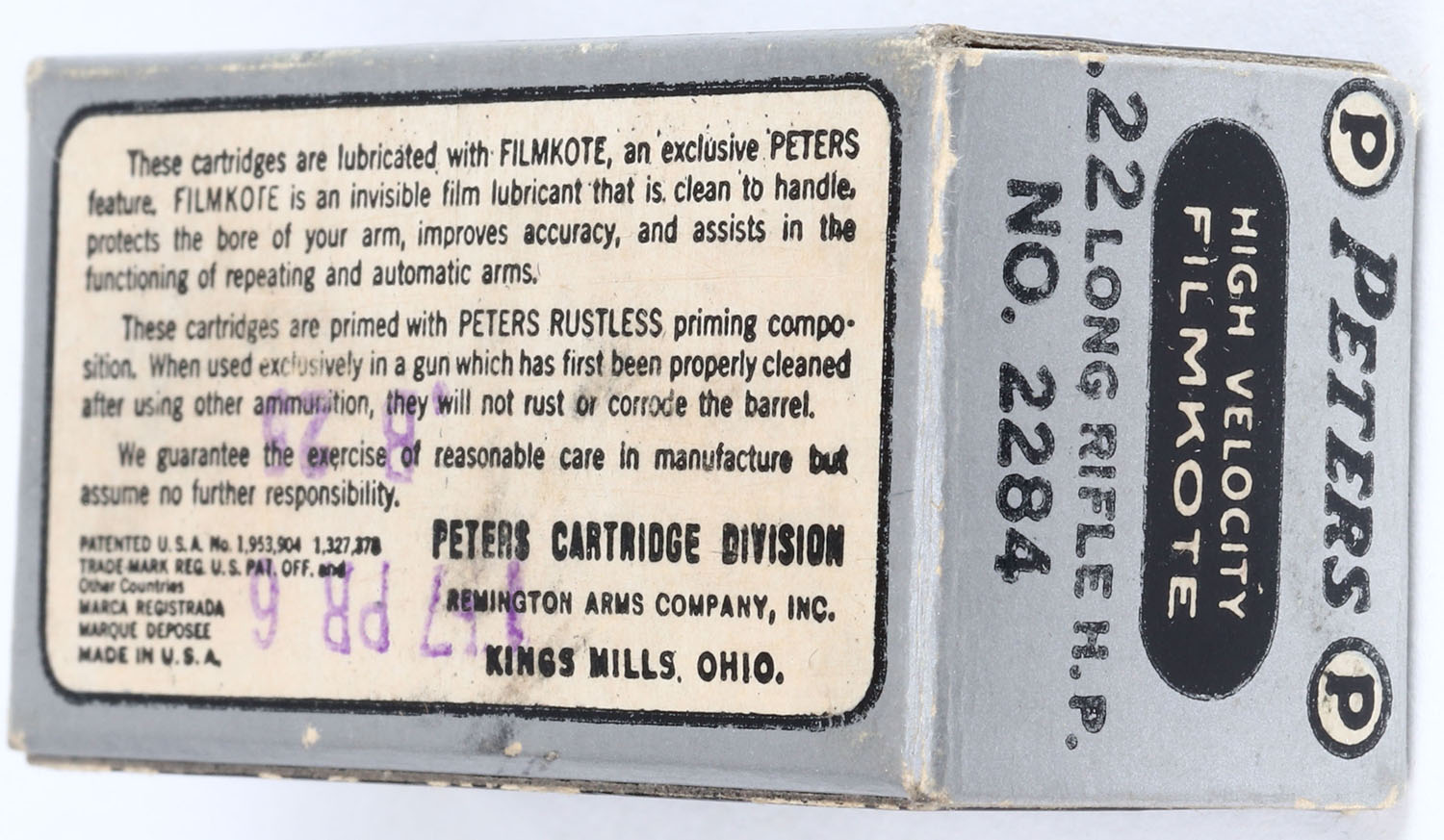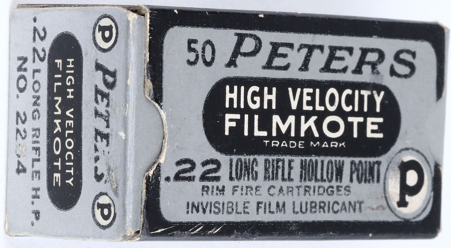 Peters, High Velocity Filmkote, .22 Long Rifle, RHWeb: S/T PCC-13 LR-2g (With nickel cases), Full, 1pc. Silver black & white box, box is solid with excellent color, very minor age soiling & corner wear, edges are crisp, end flaps are rigid, ammo is excellent. Grade: Excellent + - Value: 10 to 40