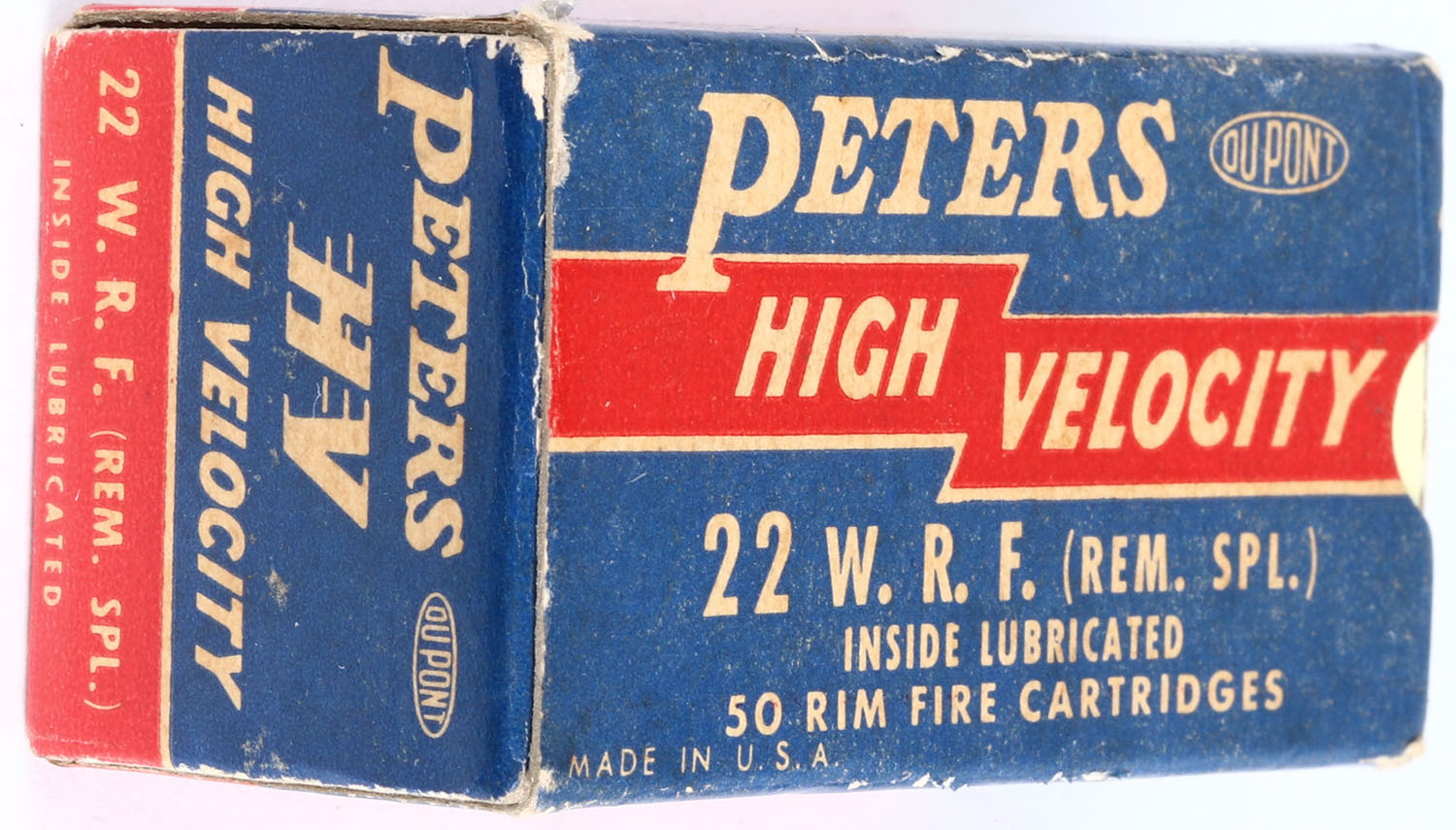 Peters, High Velocity, .22 W.R.F. (Rem. Spl.), RHWeb: PCC-17 WRF-1c, Full, 1pc. Blue red & white box, box is solid with very good color, some age soiling & corner wear, very minor edge wear, end flaps are solid, ammo is excellent. Grade: Excellent - Value: 10 to 50