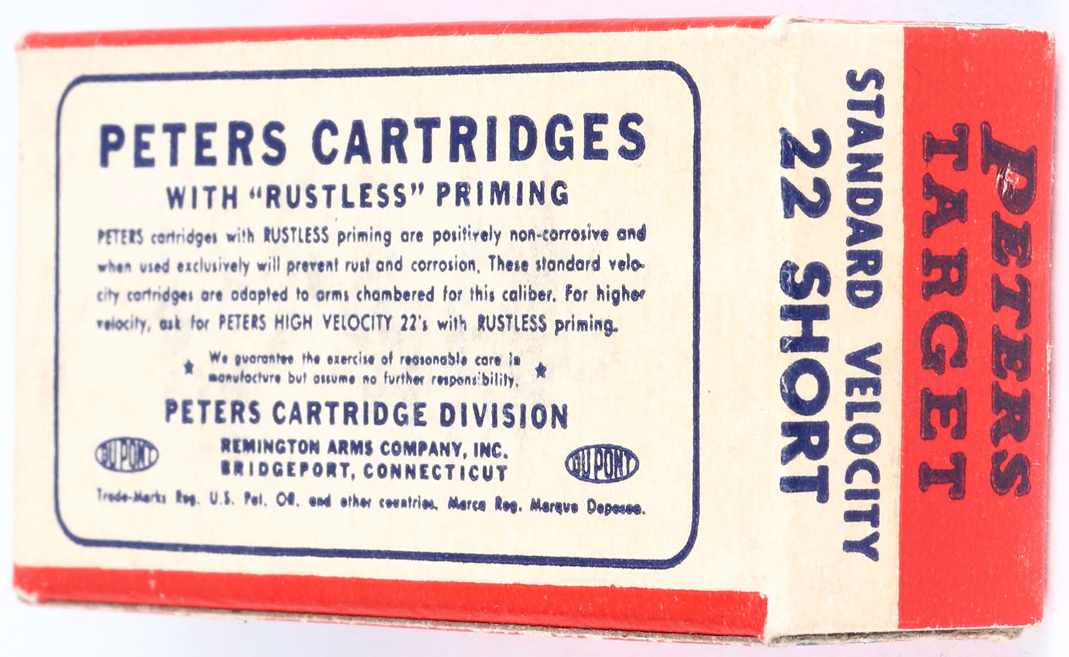 Peters, Target, .22 Short Standard Velocity, RHWeb: PCC-54D S-3, Full, 1pc. Red blue & white box, box is solid with excellent color, very minor age soiling, very minor edge & corner wear, end flaps are solid, ammo is excellent. Grade: Excellent + - Value: 4 to 20