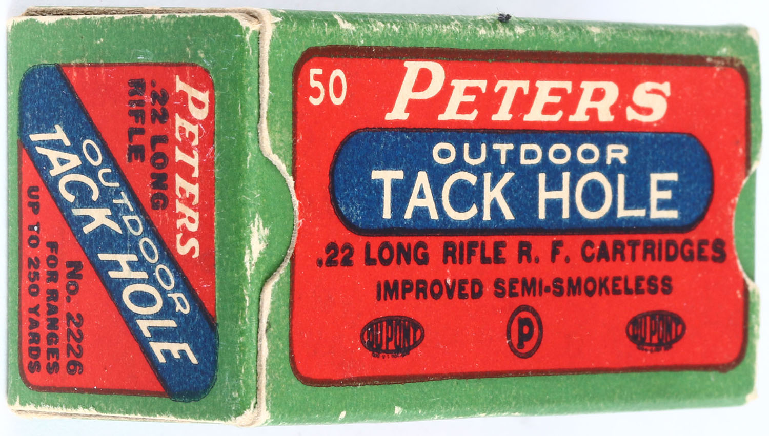 Peters, Outdoor Tack Hole, .22 Long Rifle, RHWeb: PCC-52 LR-10, Full, 1pc. Red green & blue box, box is solid with excellent color, some staining on bottom, very minor corner wear, edges are mostly crisp, end flaps are rigid, ammo is very good to excellent. Grade: Excellent + - Value: 100 to 300