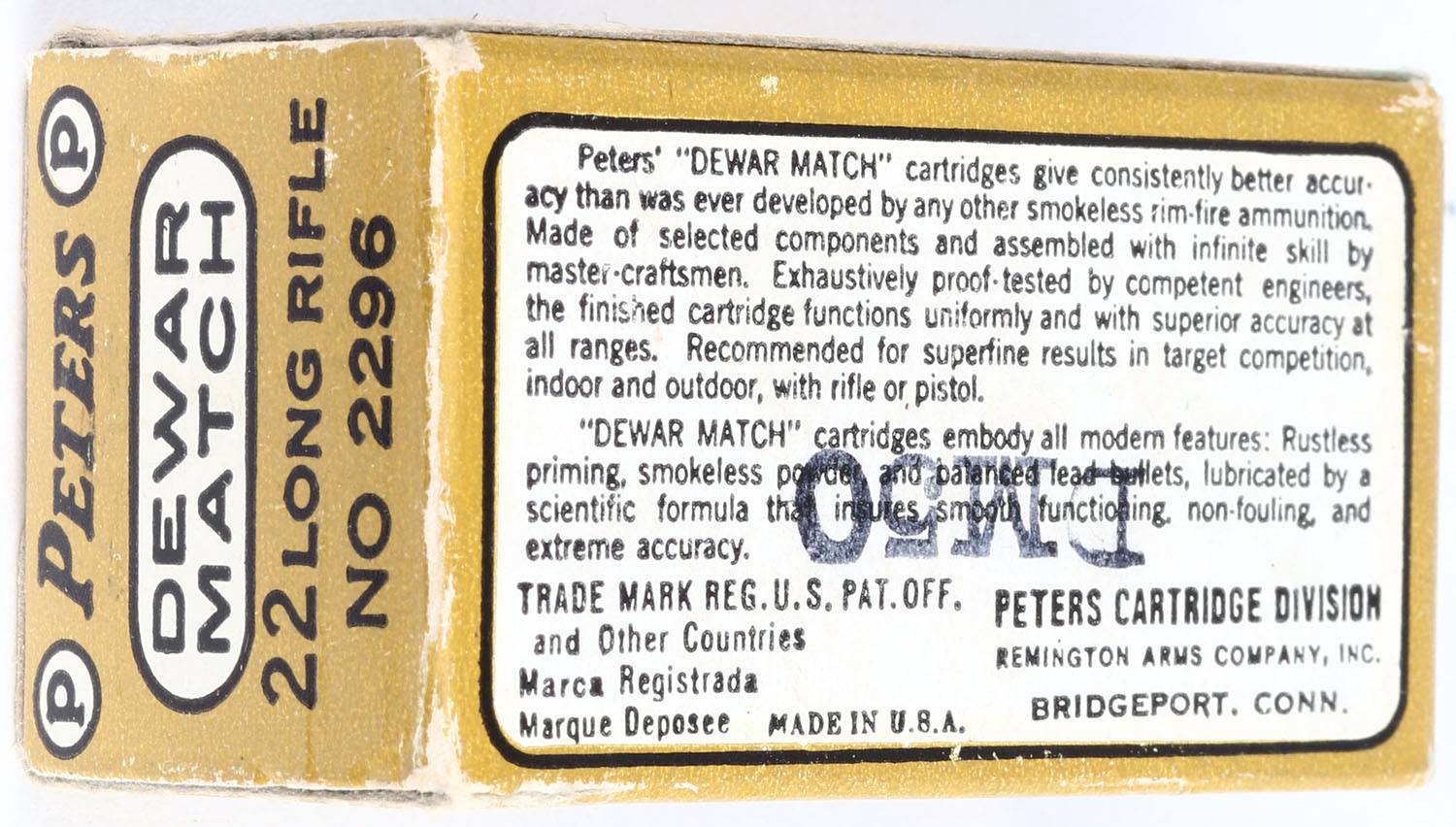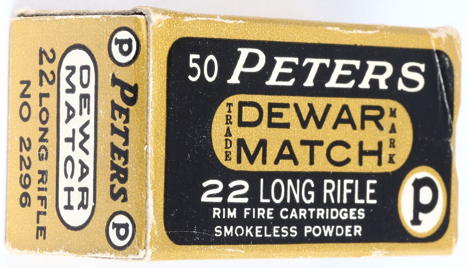 Peters, Dewar Match, .22 Long Rifle, RHWeb: PCC-53B LR-2c, Full, 1pc. Black gold & white box, box is solid with excellent color, very minor corner & edge wear, end flaps are rigid, ammo is minty. Grade: Excellent ++ - Value: 20 to 60