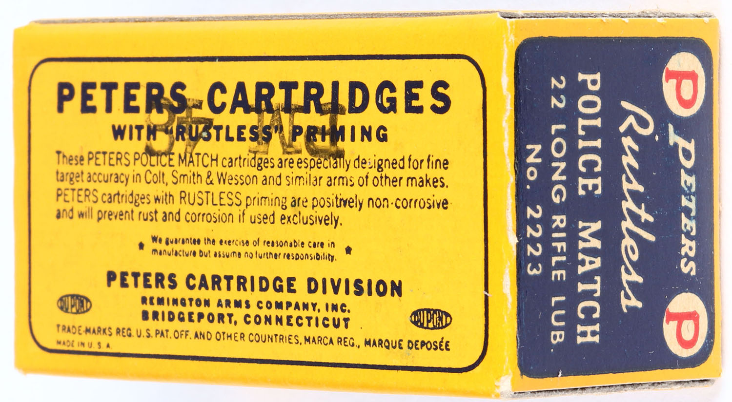 Peters, Police Match, .22 Long Rifle, RHWeb: PCC-53c LR-1b, Full, 1pc. Yellow blue & white box, box is near mint with minty color, only one very small blemish to top, corners are very sharp, edges are very crisp, end flaps are very rigid, ammo is excellent. Grade: MINT - Value: 50 to 150
